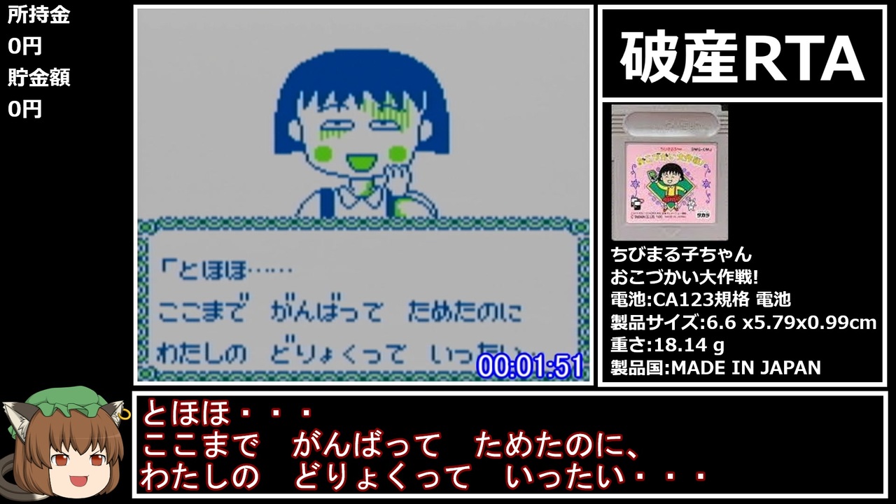 破産法 第二百五十二条 <br>裁判所は破産者について次の各号に掲げる事由のいずれにも該当しない場合には、<br>免責許可の決定をする。<br>(4)浪費又は賭と博その他の射幸行為をしたことによって著しく財産を減少させ、<br> 又は過大な債務を負担したこと。<br><br>使用機種:ゲームキューブ(ゲームボーイプレイヤ使用)<br>タイマースタート:タイトルでスタートボタンを押した時<br>タイマーストップ:ゲームオーバー後、タイトルに戻った瞬間<br><br>クリアRTA(前々走):<a href="https://www.nicovideo.jp/watch/sm40113897" class="watch">sm40113897</a><br>クリアRTA(前走):<a href="https://www.nicovideo.jp/watch/sm41431398" class="watch">sm41431398</a><br>RTAまとめ:<a href="https://www.nicovideo.jp/mylist/56827667" target="_blank" rel="noopener">mylist/56827667</a><br>更新報告:<a href="https://twitter.com/yamabukiginu" target="_blank" rel="noopener nofollow">https://twitter.com/yamabukiginu</a><br><br><a target="_blank" href="https://qa.nicovideo.jp/faq/show/19424?site_domain=default" style="font-size: 13px;color: #657586; text-decoration: underline; line-height: 1.4">この動画は投稿者によって修正されました</a>