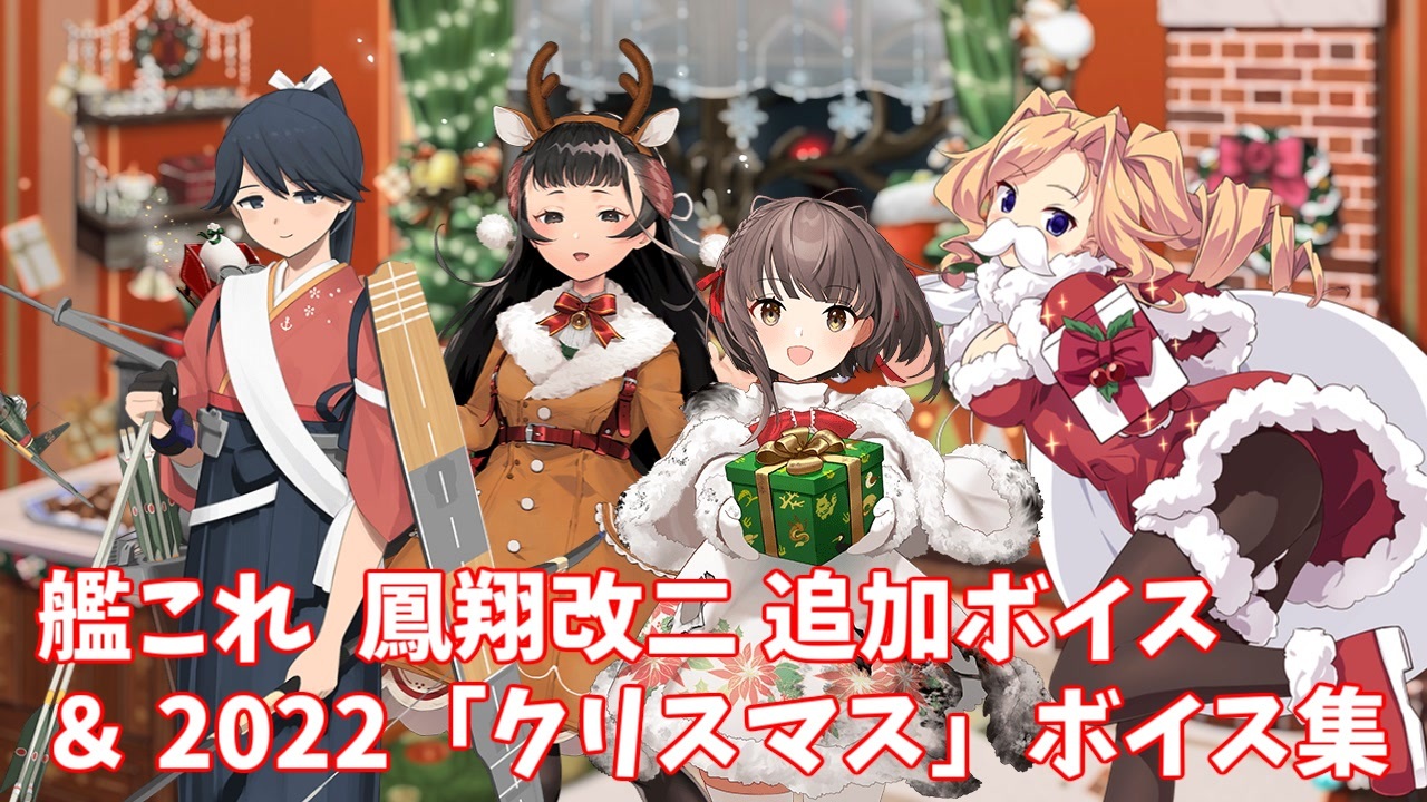 鳳翔改二の追加ボイスと、18隻の新規「クリスマス」ボイス集です。<br>※鳳翔改二戦のボイスは改二と同じようです。<br>2021年の「クリスマス」ボイスはこちら→ <a href="https://www.nicovideo.jp/watch/sm39741043" class="watch">sm39741043</a> <br><br><a href="#" class="seekTime" data-seekTime="00:04" onclick="seekNicoPlayer('#00:04'); return false;">#00:04</a> 鳳翔改二 追加ボイス<br><a href="#" class="seekTime" data-seekTime="01:02" onclick="seekNicoPlayer('#01:02'); return false;">#01:02</a> 限定ボイス(図鑑No.順)<br>(冬月 夏雲 L.d.S.D.d.Abruzzi 竹 梅 Scirocco 伊201 雲鷹 早潮 Brooklyn<br>山汐丸 倉橋 Maryland 鵜来 Langley Ranger Massachusetts Jean_Bart)<br><br>【新規絵】<br>(秋雲改二 矢矧改二 矢矧改二乙 L.d.S.D.d.Abruzzi Honolulu <br>長鯨 長鯨改 山汐丸 鵜来 Ranger Jean_Bart)<br>※鵜来が通常と中破が逆になってました……すみません。<br><br>前|2022「秋刀魚祭り」ボイス集 (11/09アップデート) <a href="https://www.nicovideo.jp/watch/sm41358558" class="watch">sm41358558</a><br><strong>次|2022「年末」ボイス集 (12/27アップデート) </strong><a href="https://www.nicovideo.jp/watch/sm41569861" class="watch">sm41569861</a><br><br>艦これ追加ボイス集 マイリスト(<a href="https://www.nicovideo.jp/mylist/40513442" target="_blank" rel="noopener">mylist/40513442</a>)<br>シリーズ(<a href="https://www.nicovideo.jp/series/34200" target="_blank" rel="noopener">series/34200</a>)<br><br>Youtubeでも活動しています。<br>チャンネル <a href="https://www.youtube.com/channel/UCTYYB9O7hiQlH6Ee-Xxlbpg" target="_blank" rel="noopener nofollow">https://www.youtube.com/channel/UCTYYB9O7hiQlH6Ee-Xxlbpg</a><br>