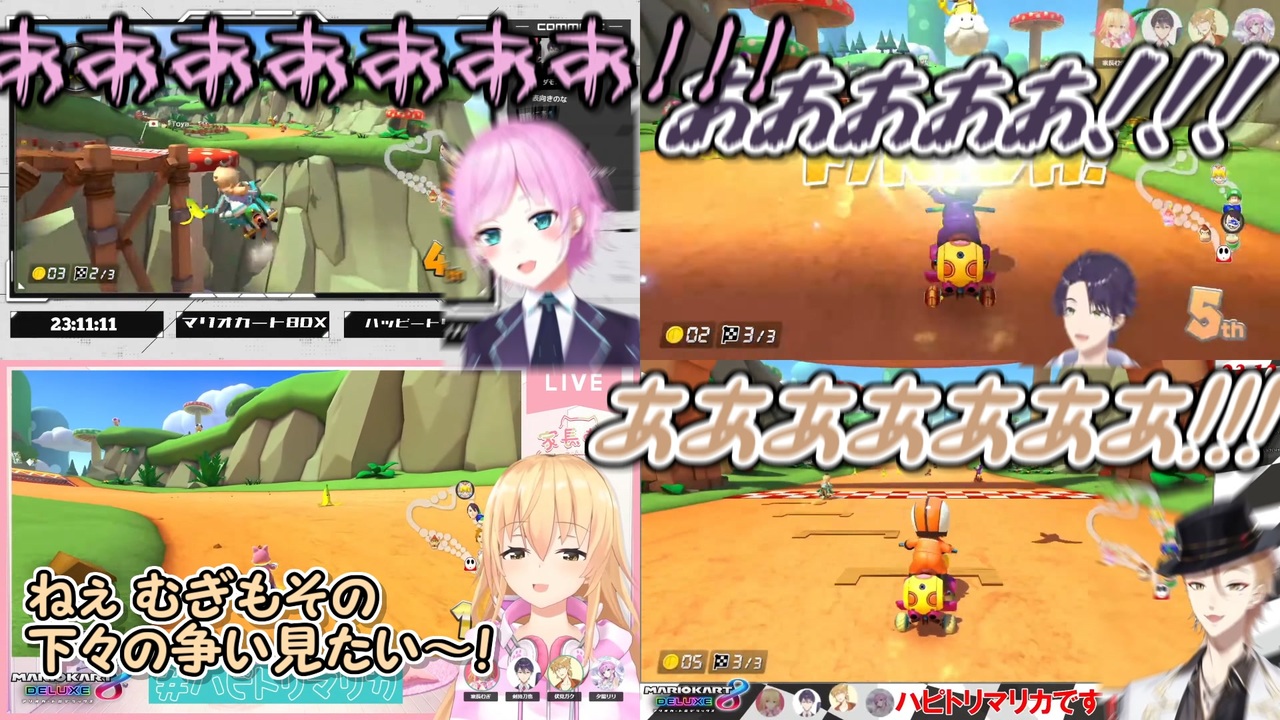 鼓膜に効きますねぇ<br><br>本家参考動画<br>・夕陽リリ<br>【ハピトリ/マリオカート8DX】さようなら、全てのハッピートリガー【夕陽リリ/にじさんじ】<br><a href="https://youtu.be/EYVTgdmkoPc" target="_blank" rel="noopener nofollow">https://youtu.be/EYVTgdmkoPc</a><br>・剣持刀也<br>【マリオカート8DX】剣持刀也vsザコ【ハピトリコラボ】<br><a href="https://youtu.be/LKkUiVPanLU" target="_blank" rel="noopener nofollow">https://youtu.be/LKkUiVPanLU</a><br>・家長むぎ<br>【 マリカ8DX 】ハピトリ最後の良心、家長むぎ【 にじさんじ 】<br><a href="https://youtu.be/Mw2TjaQUTQQ" target="_blank" rel="noopener nofollow">https://youtu.be/Mw2TjaQUTQQ</a><br>・伏見ガク<br>【ハピトリマリカ】伝説の4人が帰ってきたよ!!【にじさんじ / 伏見ガク】<br><a href="https://youtu.be/dCcnr3bhkIU" target="_blank" rel="noopener nofollow">https://youtu.be/dCcnr3bhkIU</a><br><br>参考元チャンネル&Twitter<br>・夕陽リリ<br><a href="https://www.youtube.com/@YuhiRiri" target="_blank" rel="noopener nofollow">https://www.youtube.com/@YuhiRiri</a><br><a href="https://twitter.com/Yuuhi_Riri" target="_blank" rel="noopener nofollow">https://twitter.com/Yuuhi_Riri</a><br>・剣持刀也<br><a href="https://www.youtube.com/@KenmochiToya" target="_blank" rel="noopener nofollow">https://www.youtube.com/@KenmochiToya</a><br><a href="https://twitter.com/rei_Toya_rei" target="_blank" rel="noopener nofollow">https://twitter.com/rei_Toya_rei</a><br>・家長むぎ<br><a href="https://www.youtube.com/@IenagaMugi" target="_blank" rel="noopener nofollow">https://www.youtube.com/@IenagaMugi</a><br><a href="https://twitter.com/ienaga_mugi23" target="_blank" rel="noopener nofollow">https://twitter.com/ienaga_mugi23</a><br>・伏見ガク<br><a href="https://www.youtube.com/@FushimiGaku" target="_blank" rel="noopener nofollow">https://www.youtube.com/@FushimiGaku</a><br><a href="https://twitter.com/gaku_fushimi" target="_blank" rel="noopener nofollow">https://twitter.com/gaku_fushimi</a><br><br>ニコニコのダイコンマンリスト<br>「バーチャルYouTuberシリーズ」↓<br><a href="https://www.nicovideo.jp/mylist/62551838" target="_blank" rel="noopener">mylist/62551838</a><br>「バーチャルYouTuberシリーズ2」↓<br><a href="https://www.nicovideo.jp/mylist/67858437" target="_blank" rel="noopener">mylist/67858437</a><br>「バーチャルYouTuberシリーズ3」↓<br><a href="https://www.nicovideo.jp/mylist/71340675" target="_blank" rel="noopener">mylist/71340675</a><br>「バーチャルYouTuberシリーズ4」↓<br><a href="https://www.nicovideo.jp/mylist/73995264" target="_blank" rel="noopener">mylist/73995264</a><br><br>ダイコンマンのTwitter<br><a href="https://twitter.com/Daikon_Man_V" target="_blank" rel="noopener nofollow">https://twitter.com/Daikon_Man_V</a>