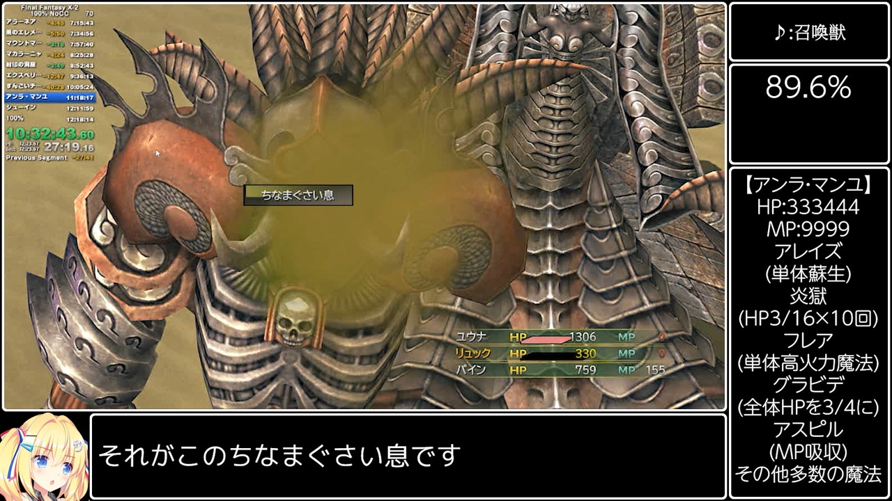 ブレス系の技使われたら息止めればよくないか~?<br><br>【ゲーム概要】<br>・FINAL FANTASY X-2 (ファイナルファンタジー10-2)<br>・PC版 Steam<br>・100%<br>・No Creature Creator (クリーチャークリエイト禁止)<br>・計測区間:New Game選択~終了画面100%表示<br>・セーブ機能使用<br>・バグ技禁止<br>・チートコマンド禁止 (倍速機能など)<br><br>【リンク】<br>Part1:<a href="https://www.nicovideo.jp/watch/sm40776052" target="_blank" rel="noopener nofollow">https://www.nicovideo.jp/watch/sm40776052</a><br><br>マイリスト:<a href="https://www.nicovideo.jp/mylist/73452210" target="_blank" rel="noopener nofollow">https://www.nicovideo.jp/mylist/73452210</a><br><br>YouTube:<a href="https://youtu.be/aJuI3rldkhc" target="_blank" rel="noopener nofollow">https://youtu.be/aJuI3rldkhc</a><br><br>未編集ノーカーット超大作:<a href="https://youtu.be/xeSsCrFZYeg" target="_blank" rel="noopener nofollow">https://youtu.be/xeSsCrFZYeg</a><br><br>Twitter:<a href="https://twitter.com/lunearcenciel" target="_blank" rel="noopener nofollow">https://twitter.com/lunearcenciel</a><br><br>Copyright (C) 2001, 2003, 2019 SQUARE ENIX CO., LTD. All Rights Reserved.