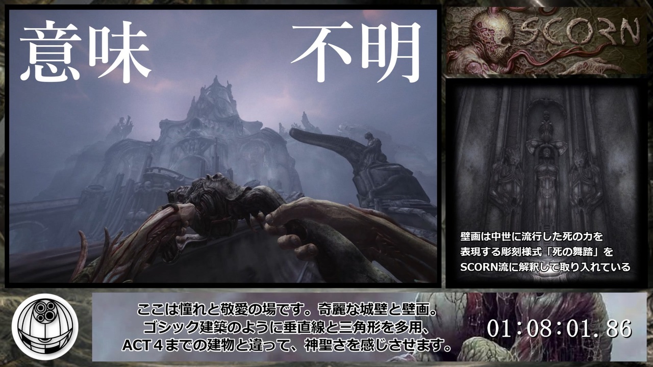 <span style="color: #ff0000; font-size: 24px;">意味不明</span><br><br>今回は「ACT5」<br><br><br><br><br><br><br><br><br><br><br><br><br><br><span style="font-size: 16px;"><strong>以下、駄文</strong></span><br><br>てうぃー氏のエイリアンRTAを初めて観たころ、私はこのゲームの存在を知りました。開発に時間がかかっていたらしいのですが、体験版の実況などを見ていくにつれて、私が抱いていたこのゲームへの期待はどんどん高まっていきました。<br><br>そんな中、スコーンがついに発売されると聞いた私はうきうきしていました。発売まで「はやくやりたい」という気持ちで眠りづらかった日もありました。<br><br>そんな中迎えた発売日。私を迎えたのは…<strong>世界観がただ良いだけの謎ゲーでした。</strong><br><br>最初こそ世界観やデザインに圧倒されたものの、マップ機能なし、どこに向かえばいいか一切分からない上にクソ広い施設、文面での説明や会話が一切無し、敵に襲われ景色を見る暇が無かったり、遠距離攻撃ばかりしてくるクソ敵たち、ムカデによる継続ダメージ、シビアな体力管理、それに加えて難易度設定は無し。Steamではおおむね好評価ですが、その大半は世界観などに向けられたもの。ゲーム性を評価している人はほぼ皆無です。<br><br>そして、一切明かされない主人公の正体、目的、この世界。特にラストシーンは意味が分からなさすぎて、茫然としていました。「程良い分からなさはゲームの魅力を引き立てますが、分からなさすぎると逆に魅力を殺してしまう」これが私の正直な感想です。<br><br>世界観は間違いなく傑作です(意味不明な点が多いことを除けば)。しかし、ゲームとして見るなら…これは紛うことなきクソゲーです。<br><br>この動画はその世界観をまとめるために制作しました。楽しんでもらえたら幸いです。<br><br>これはあくまで個人の感想です。長文、失礼しました。<br><br>結構ボロカスに言ったから色々言われるかもしれんけど、楽しみにしていた点とプレゼントされたゲームである点を考慮して、変な擁護はせずにしっかりと自分の感想を述べるべきだと考えました<br><br><br>ようつべ→<a href="https://www.youtube.com/channel/UCbLammdysAJ4P0pVCZeh-lQ" target="_blank" rel="noopener nofollow">https://www.youtube.com/channel/UCbLammdysAJ4P0pVCZeh-lQ</a><br>Alien:IsolationのRTA → <a href="https://www.nicovideo.jp/watch/sm40679861" class="watch">sm40679861</a><br>Aliens vs. PredatorのRTA → <a href="https://www.nicovideo.jp/watch/sm41140849" class="watch">sm41140849</a>