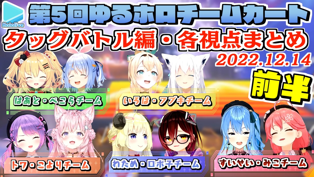 <a href="#" class="seekTime" data-seekTime="00:00" onclick="seekNicoPlayer('#00:00'); return false;">#00:00</a> 顔合わせ<br><a href="#" class="seekTime" data-seekTime="01:59" onclick="seekNicoPlayer('#01:59'); return false;">#01:59</a> 第1レース目:エキサイトバイク<br><a href="#" class="seekTime" data-seekTime="07:24" onclick="seekNicoPlayer('#07:24'); return false;">#07:24</a> 第2レース目:メリーメリーマウンテン<br><a href="#" class="seekTime" data-seekTime="12:58" onclick="seekNicoPlayer('#12:58'); return false;">#12:58</a> 第3レース目:テレサレイク<br><a href="#" class="seekTime" data-seekTime="16:51" onclick="seekNicoPlayer('#16:51'); return false;">#16:51</a> 第4レース目:パリプロムナード<br><a href="#" class="seekTime" data-seekTime="23:33" onclick="seekNicoPlayer('#23:33'); return false;">#23:33</a> 前半の結果<br><br>元動画様はこちら<br>【マリオカート8DX】む…無免許運転なわけないじゃないですか~~えっと…ふわふわ~~ #ゆるホロチームカート【ロボ子さん/ホロライブ】<br><a href="https://youtu.be/Zd3lNv0uvWg" target="_blank" rel="noopener nofollow">https://youtu.be/Zd3lNv0uvWg</a><br><br>【ゆるホロチームカート】チーム対抗勝負!?全力でたのしむぞおおお!わくわく~~~!【ホロライブ/赤井はあと】<br><a href="https://youtu.be/MBUn_MS3Dtw" target="_blank" rel="noopener nofollow">https://youtu.be/MBUn_MS3Dtw</a><br><br>【ゆるホロチームカート】トップスピードで走るのが白上の人生【ホロライブ/白上フブキ】<br><a href="https://youtu.be/wGyY_LOVNIY" target="_blank" rel="noopener nofollow">https://youtu.be/wGyY_LOVNIY</a><br><br>【 マリカ8DX 】#ゆるホロチームカート で爆走すっぞ!!!!!!!にぇ!!!!!【ホロライブ/さくらみこ】<br><a href="https://youtu.be/NTtsbEiuZ50" target="_blank" rel="noopener nofollow">https://youtu.be/NTtsbEiuZ50</a><br><br>【マリカ8DX】ホロメンでチーム対抗勝負!!!!!!!!ぺこ!【ホロライブ/兎田ぺこら】<br><a href="https://youtu.be/giYJ3GFD-FI" target="_blank" rel="noopener nofollow">https://youtu.be/giYJ3GFD-FI</a><br><br>【ゆるホロチームカート 】コース増えすぎてませんか!?【ホロライブ / 星街すいせい】<br><a href="https://youtu.be/QXcjYRFfT2M" target="_blank" rel="noopener nofollow">https://youtu.be/QXcjYRFfT2M</a><br><br>【ゆるホロチームカート】みんなでエンジョイジョイ!!!【角巻わため/ホロライブ4期生】<br><a href="https://youtu.be/DcLctaVMhUk" target="_blank" rel="noopener nofollow">https://youtu.be/DcLctaVMhUk</a><br><br>【ゆるホロチームカート】新コースもでたことだし、ゆるっと協力バトルしちゃいますか【常闇トワ視点/ホロライブ】<br><a href="https://youtu.be/yfrm24s7DA0" target="_blank" rel="noopener nofollow">https://youtu.be/yfrm24s7DA0</a><br><br>【マリオカート8DX】#ゆるホロチームカート で練習の成果を出せるかな!???【博衣こより/ホロライブ】<br><a href="https://youtu.be/6qhFUWoash8" target="_blank" rel="noopener nofollow">https://youtu.be/6qhFUWoash8</a><br><br>【ゆるホロチームカート】マリオカート力とパワーでがんばります【風真いろは/ホロライブ】<br><a href="https://youtu.be/BZRWtV2cY3s" target="_blank" rel="noopener nofollow">https://youtu.be/BZRWtV2cY3s</a><br /><span style="color: #b7b7b7; font-size: 10px;">ホロライブ切り抜き/なめたけ <a href="https://t.co/CBwJLnYR2c" target="_blank" rel="noopener nofollow">https://t.co/CBwJLnYR2c</a></span>