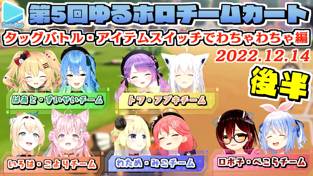 <a href="#" class="seekTime" data-seekTime="00:00" onclick="seekNicoPlayer('#00:00'); return false;">#00:00</a> 顔合わせ<br><a href="#" class="seekTime" data-seekTime="02:31" onclick="seekNicoPlayer('#02:31'); return false;">#02:31</a> 第1レース目:ミュージックパーク<br><a href="#" class="seekTime" data-seekTime="05:26" onclick="seekNicoPlayer('#05:26'); return false;">#05:26</a> 第2レース目:ロンドンアベニュー<br><a href="#" class="seekTime" data-seekTime="08:42" onclick="seekNicoPlayer('#08:42'); return false;">#08:42</a> 第3レース目:ミュートシティ<br><a href="#" class="seekTime" data-seekTime="12:25" onclick="seekNicoPlayer('#12:25'); return false;">#12:25</a> 第4レース目:ベビィパーク<br><a href="#" class="seekTime" data-seekTime="16:08" onclick="seekNicoPlayer('#16:08'); return false;">#16:08</a> 後半の結果<br><br>元動画様はこちら<br>【マリオカート8DX】む…無免許運転なわけないじゃないですか~~えっと…ふわふわ~~ #ゆるホロチームカート【ロボ子さん/ホロライブ】<br><a href="https://youtu.be/Zd3lNv0uvWg" target="_blank" rel="noopener nofollow">https://youtu.be/Zd3lNv0uvWg</a><br><br>【ゆるホロチームカート】チーム対抗勝負!?全力でたのしむぞおおお!わくわく~~~!【ホロライブ/赤井はあと】<br><a href="https://youtu.be/MBUn_MS3Dtw" target="_blank" rel="noopener nofollow">https://youtu.be/MBUn_MS3Dtw</a><br><br>【ゆるホロチームカート】トップスピードで走るのが白上の人生【ホロライブ/白上フブキ】<br><a href="https://youtu.be/wGyY_LOVNIY" target="_blank" rel="noopener nofollow">https://youtu.be/wGyY_LOVNIY</a><br><br>【 マリカ8DX 】#ゆるホロチームカート で爆走すっぞ!!!!!!!にぇ!!!!!【ホロライブ/さくらみこ】<br><a href="https://youtu.be/NTtsbEiuZ50" target="_blank" rel="noopener nofollow">https://youtu.be/NTtsbEiuZ50</a><br><br>【マリカ8DX】ホロメンでチーム対抗勝負!!!!!!!!ぺこ!【ホロライブ/兎田ぺこら】<br><a href="https://youtu.be/giYJ3GFD-FI" target="_blank" rel="noopener nofollow">https://youtu.be/giYJ3GFD-FI</a><br><br>【ゆるホロチームカート 】コース増えすぎてませんか!?【ホロライブ / 星街すいせい】<br><a href="https://youtu.be/QXcjYRFfT2M" target="_blank" rel="noopener nofollow">https://youtu.be/QXcjYRFfT2M</a><br><br>【ゆるホロチームカート】みんなでエンジョイジョイ!!!【角巻わため/ホロライブ4期生】<br><a href="https://youtu.be/DcLctaVMhUk" target="_blank" rel="noopener nofollow">https://youtu.be/DcLctaVMhUk</a><br><br>【ゆるホロチームカート】新コースもでたことだし、ゆるっと協力バトルしちゃいますか【常闇トワ視点/ホロライブ】<br><a href="https://youtu.be/yfrm24s7DA0" target="_blank" rel="noopener nofollow">https://youtu.be/yfrm24s7DA0</a><br><br>【マリオカート8DX】#ゆるホロチームカート で練習の成果を出せるかな!???【博衣こより/ホロライブ】<br><a href="https://youtu.be/6qhFUWoash8" target="_blank" rel="noopener nofollow">https://youtu.be/6qhFUWoash8</a><br><br>【ゆるホロチームカート】マリオカート力とパワーでがんばります【風真いろは/ホロライブ】<br><a href="https://youtu.be/BZRWtV2cY3s" target="_blank" rel="noopener nofollow">https://youtu.be/BZRWtV2cY3s</a><br /><span style="color: #b7b7b7; font-size: 10px;">ホロライブ切り抜き/なめたけ <a href="https://t.co/CBwJLnYR2c" target="_blank" rel="noopener nofollow">https://t.co/CBwJLnYR2c</a></span>