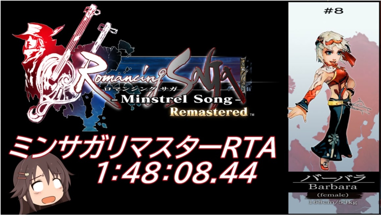 12/3に出した記録です。<br>Speedrun.comに申請した時の無編集版はこちら↓<br><a href="https://www.youtube.com/watch?v=mdUahLnADrY&t=1147s" target="_blank" rel="noopener nofollow">https://www.youtube.com/watch?v=mdUahLnADrY&t=1147s</a><br><br>(12/17 2:18追記)<br>とりあえず再送して1:38:31.69出しておきました(*´ω`*)<br><br>~~~~~~~~~~~~~~~~~~~~~~~~~~~~~~~~~~~~~~~~<br>使用ハード :Steam - NG<br>コントローラ:HORI THE IDOLM@STER CINDERELLA GIRLS CONTROLLER ✧ニュージェネレーションズ Ver.✧<br><br>タイマースタート:NEW GAME を押した瞬間<br>タイマーストップ:クリアデータをセーブし、「セーブが完了しました」が表示された瞬間<br><br>~~~~~~~~~~~~~~~~~~~~~~~~~~~~~~~~~~~~~~~~<br>『Romancing SaGa -Minstrel Song- Remastered(ロマンシング サガ -ミンストレルソング- リマスター)』<br>生配信及び動画・画像投稿に関するガイドライン<br><a href="https://www.jp.square-enix.com/game/guideline/saga_minstrelsong/" target="_blank" rel="noopener nofollow">https://www.jp.square-enix.com/game/guideline/saga_minstrelsong/</a><br><br>権利表記:<br>© 1992, 2005, 2022 SQUARE ENIX CO., LTD. All Rights Reserved.<br>ILLUSTRATION: TOMOMI KOBAYASHI<br>当該作品の転載・配布は禁止いたします。<br>~~~~~~~~~~~~~~~~~~~~~~~~~~~~~~~~~~~~~~~~<br><br>○参考にしたもの<br>・【ミンサガリマスター先行配信】配信制限の3時間以内にクリアを目指す!【ネタバレ注意】 (おやつ氏)<br><a href="https://www.youtube.com/watch?v=Ni1h3itlMRQ&t=9577s" target="_blank" rel="noopener nofollow">https://www.youtube.com/watch?v=Ni1h3itlMRQ&t=9577s</a><br><br>・ミンサガ極限攻略データベース<br><a href="https://kyokugen.info/minsaga/minstrel_sei.html" target="_blank" rel="noopener nofollow">https://kyokugen.info/minsaga/minstrel_sei.html</a><br><br>・デレマスゆっくり<br>ドダメイクPさん(<a href="https://seiga.nicovideo.jp/seiga/im5357197" target="_blank" rel="noopener">im5357197</a>)作成