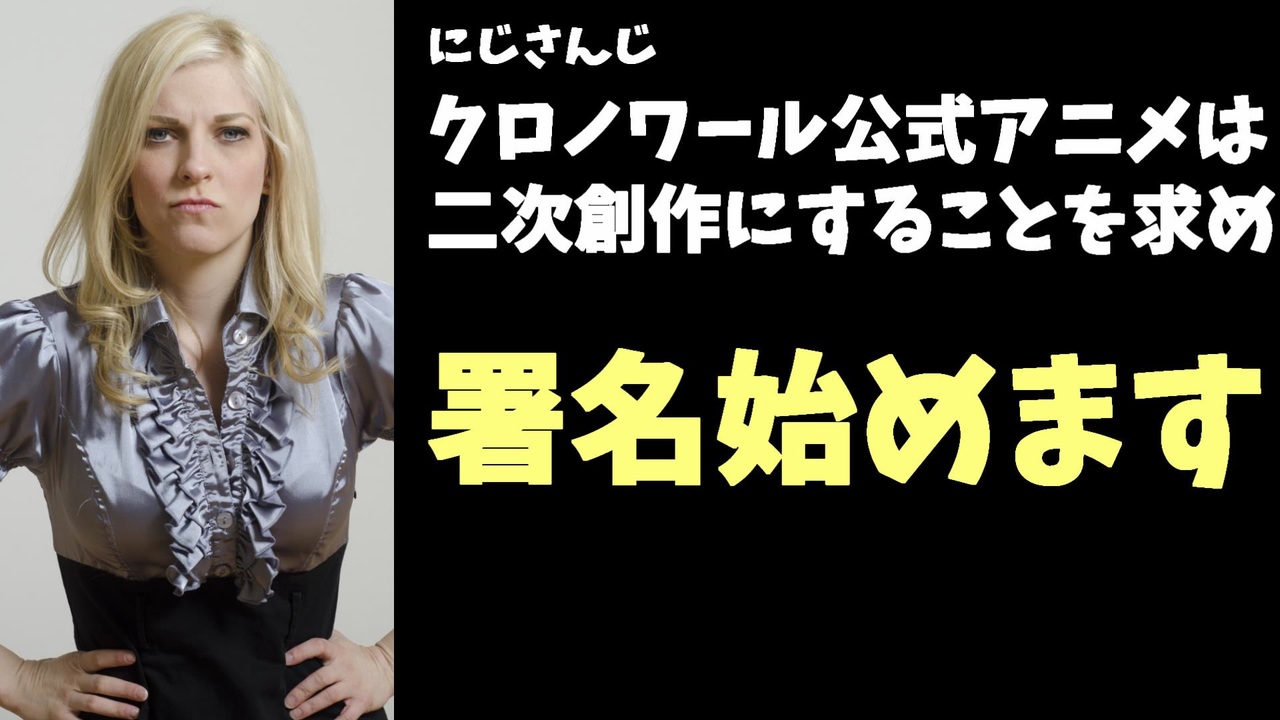 2022年12月12日、にじさんじ所属バーチャルライバー叶 と 葛葉 のユニットのクロノワールのアニメ化が発表、叶と葛葉が語る150年前の実話を元にしたショートアニメーションなのだそうですが、なぜかそのアニメに対し実話設定の削除と二次創作明記を求める署名が始まりました。<br><br>引用<br><a href="https://chronoir0.com/" target="_blank" rel="noopener nofollow">https://chronoir0.com/</a><br><a href="https://www.change.org/" target="_blank" rel="noopener nofollow">https://www.change.org/</a><br><br>Youtube <a href="https://www.youtube.com/channel/UCzYQPx8MeE99DUkW9Y_txJw" target="_blank" rel="noopener nofollow">https://www.youtube.com/channel/UCzYQPx8MeE99DUkW9Y_txJw</a><br>twitter <a href="https://twitter.com/V_Virgin_Mary" target="_blank" rel="noopener nofollow">https://twitter.com/V_Virgin_Mary</a><br><br>使用素材<br>高品質なフリー動画素材 - Pixabay <a href="https://pixabay.com/ja/videos" target="_blank" rel="noopener nofollow">https://pixabay.com/ja/videos</a>