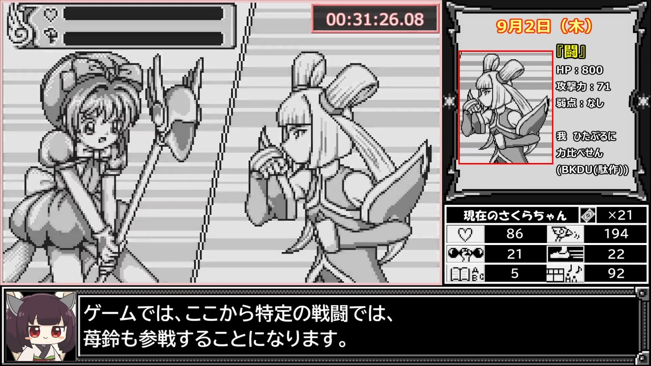 『夜の歌』だいすき<br>他の挿入歌も含めて収録されてる<br>『カードキャプターさくら ソングコレクション』<br>なるものが配信されてるらしいっすよ?(宣伝)<br><br>8月28日~11月13日まで<br><br>次回公開予定は【12/22(木) 18:00】です<br><a href="https://www.nicovideo.jp/watch/sm41500822" class="watch">sm41500822</a>←前|<a href="https://www.nicovideo.jp/mylist/74169174" target="_blank" rel="noopener">mylist/74169174</a>|次→<a href="https://www.nicovideo.jp/watch/sm41517695" class="watch">sm41517695</a><br><br>RTA part1集 <a href="https://www.nicovideo.jp/mylist/71936684" target="_blank" rel="noopener">mylist/71936684</a><br>進捗報告とか <a href="https://twitter.com/KemotooooN_RTA" target="_blank" rel="noopener nofollow">https://twitter.com/KemotooooN_RTA</a><br><br><strong><u>▼レギュレーション/縛り等</u></strong><br>・計測開始:『さいしょから』を選択した瞬間<br>・計測終了:『月』に最後の一撃を与えた瞬間<br>・小狼エンドの条件を満たすこと