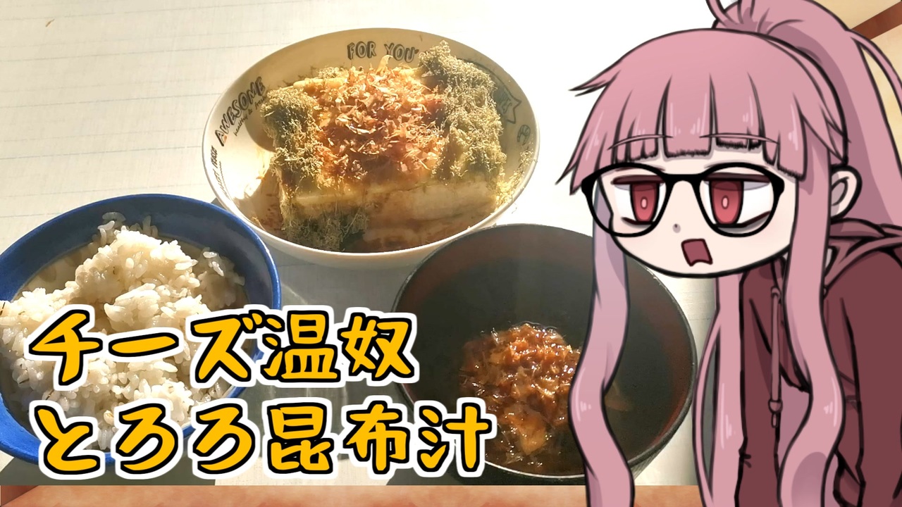 この動画は人生セミリタイアを目指す茜ちゃんさんが<br>大体100円ぐらいの飯を作って満足する動画です。<br><br><br>今回のレシピは「チーズ温奴ととろろ昆布汁」<br><br><br>豆腐ととろろ昆布で、ちょっとした節約定食。<br><br>●YouTube版<br><a href="https://youtu.be/NmQC92ZeQ5c" target="_blank" rel="noopener nofollow">https://youtu.be/NmQC92ZeQ5c</a><br><br /><span style="color: #ff0000; font-size: 24px;"><strong>釧路を紹介するブログ始めました</strong></span>:<a href="https://946de2100.com" target="_blank" rel="noopener nofollow">https://946de2100.com</a><br><br><span style="color: #ff0000; font-size: 16px;"><strong>●おススメ動画:</strong></span><span style="color: #ff0000; font-size: 18px;"><strong>【歴史解説】かつて 釧路を支配していたのは佐賀だった ~釧路元町の始まりと佐野孫右衛門の盛衰~</strong></span><br><br><a href="https://www.nicovideo.jp/watch/sm44267722" class="watch">sm44267722</a><br><br><br><span style="color: #ff0000; font-size: 18px;"><strong>●YouTubeチャンネルも登録よろしくお願いします</strong></span><br><strong>釧路チャンネル <a href="https://www.youtube.com/@znd-kaisetu" target="_blank" rel="noopener nofollow">https://www.youtube.com/@znd-kaisetu</a></strong><br>恋結シラリカソロチャンネル <a href="https://www.youtube.com/@enmusubi-shirarika" target="_blank" rel="noopener nofollow">https://www.youtube.com/@enmusubi-shirarika</a><br><br><br>ほしいものリスト <a href="https://www.amazon.jp/hz/wishlist/ls/2OUUB1JQSRUWG?ref_=wl_share" target="_blank" rel="noopener nofollow">https://www.amazon.jp/hz/wishlist/ls/2OUUB1JQSRUWG?ref_=wl_share</a><br>クリエイターサポート<a href="https://creator-support.nicovideo.jp/registration/116665199" target="_blank" rel="noopener nofollow">https://creator-support.nicovideo.jp/registration/116665199</a>