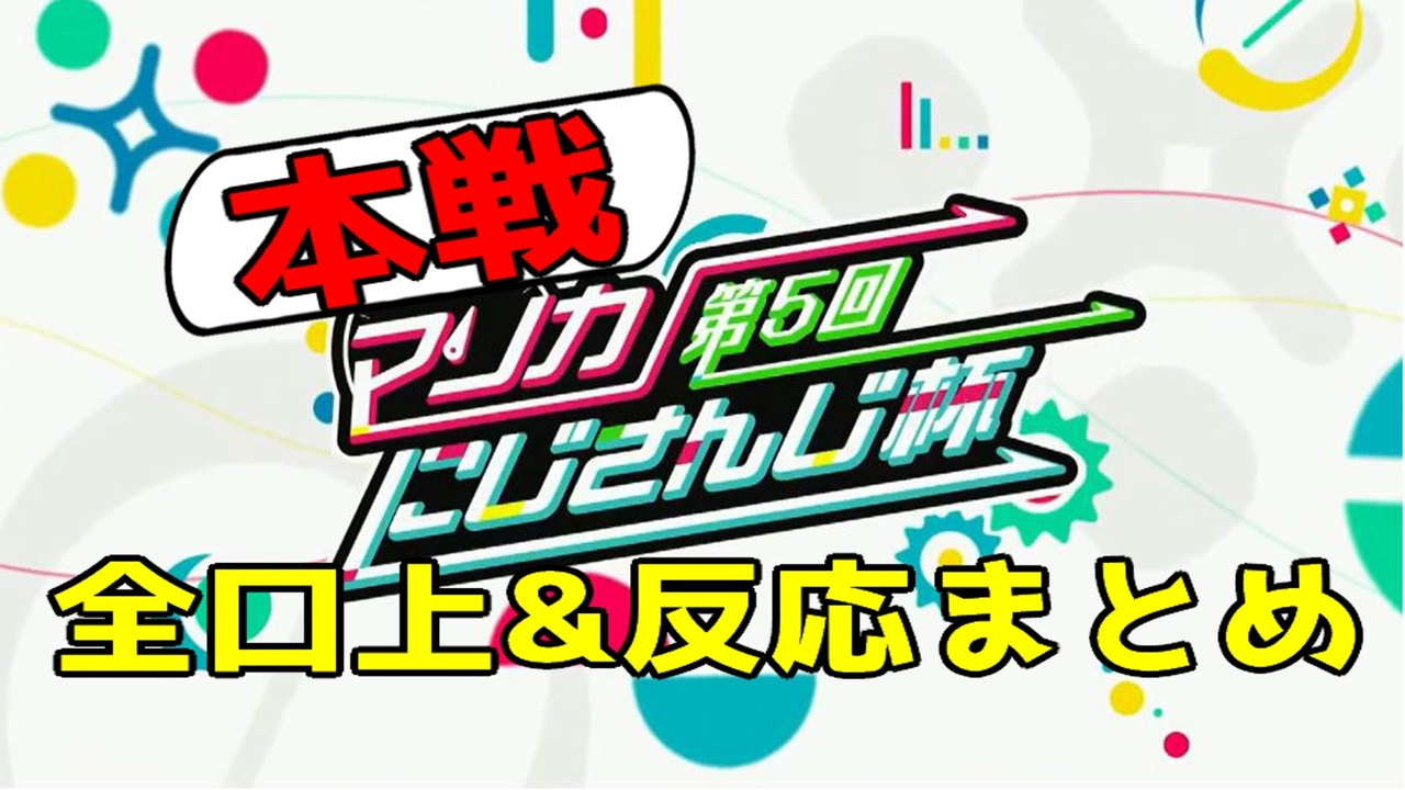 マリカにじさんじ杯本戦の全口上とそのリアクションをまとめた動画です。<br>口上に対するリアクションの無い配信はまとめていません。<br>漏れがあったらすいません。<br>(アーカイブ無し、切り抜き禁止、配信トラブルなどの理由で切り抜きの無いライバーは名前の後ろに※で表記)<br><br>以下敬称略<br><br>Aリーグ<br>不破湊、ラトナ・プティ※、来栖夏芽、フレン・E・ルスタリオ、アルス・アルマル※、葛葉、本間ひまわり※、アンジュ・カトリーナ、ベルモンド・バンデラス、イブラヒム、春崎エアル※、笹木咲<br><br>Bリーグ<br>空星きらめ、エクス・アルビオ※、渡会雲雀、先斗寧、卯月コウ※、セラフ・ダズルガーデン、風楽奏斗、星川サラ、魔使マオ、甲斐田晴、竜胆尊、長尾景<br><br>Cリーグ<br>小野町春香、叶、天宮こころ、家長むぎ※、白雪巴、成瀬鳴、葉加瀬冬雪、魔界ノりりむ※、夕陽リリ、夜見れな※、シェリン・バーガンディ※<br><br>Dリーグ<br>奈羅花、社築、愛園愛美、北小路ヒスイ、剣持刀也、三枝明那、鷹宮リオン、花畑チャイカ、山神カルタ、レオス・ヴィンセント※、ローレン・イロアス※<br><br>+α<br><span style="color: #ffffff;">天ヶ瀬むゆ、海妹四葉、四季凪アキラ</span><br><br>※レオス枠、アーカイブ復旧作業中のため映像無し、復旧次第完全版の作成・投稿予定<br><br>予選A~Cリーグ:<a href="https://www.nicovideo.jp/watch/sm41522563" class="watch">sm41522563</a> 予選D~Gリーグ:<a href="https://www.nicovideo.jp/watch/sm41522573" class="watch">sm41522573</a>