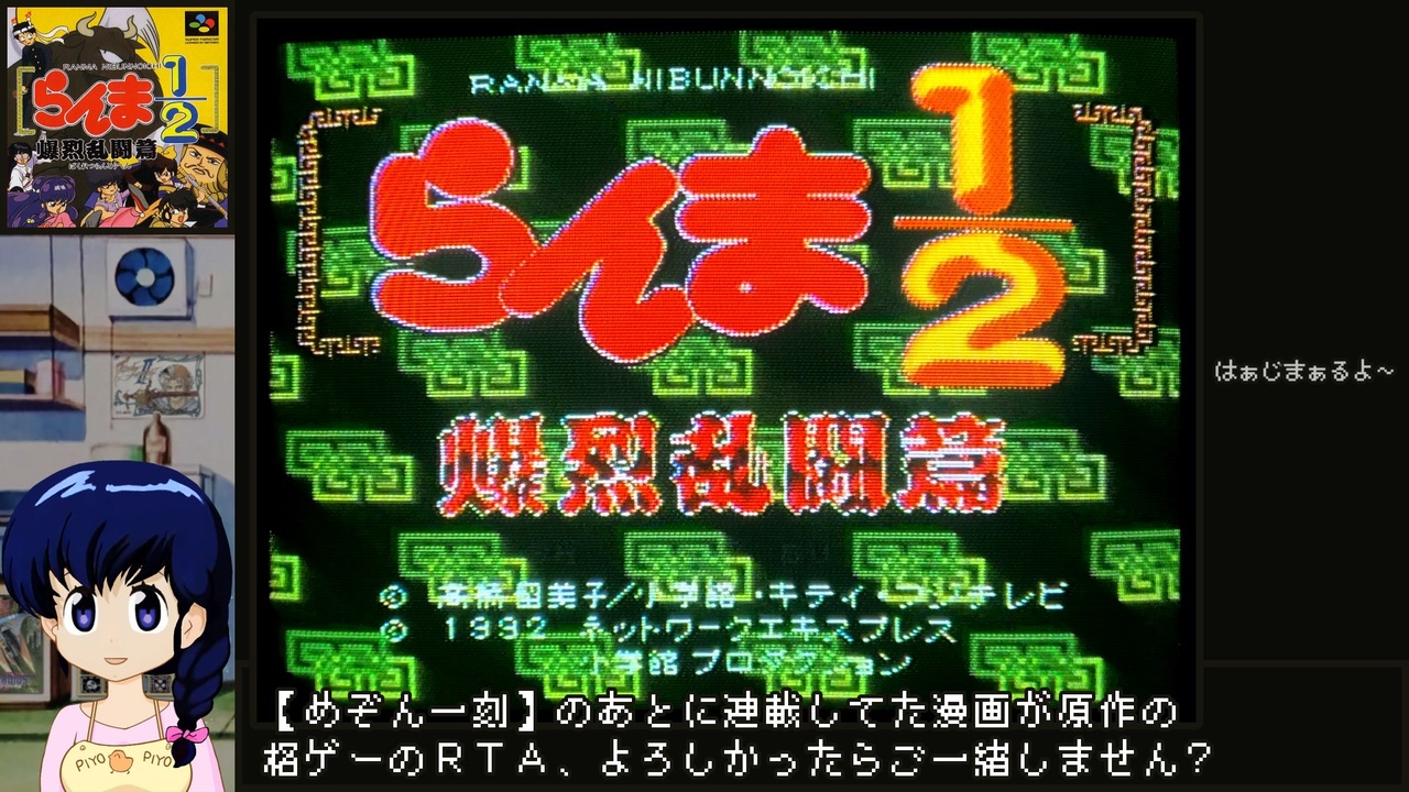 1992年12月25日に発売された格闘ゲームでっす!(30周年)<br><br>【ブラウン管テレビ】でのファミコンの映像を動画で綺麗に遺せないかな~って画策している動画でっす。<br>(※1080pでの視聴を前提にしてるので、1920x1080以下のサイズだとモアレが酷くなる可能性がありまぁす)<br><br>難易度は RED、計測区間は Speedrun.com に合わせておきました。<br>→<a href="https://www.speedrun.com/ranma__hard_battle?h=Red&rules=category&x=w20wv5od" target="_blank" rel="noopener nofollow">https://www.speedrun.com/ranma__hard_battle?h=Red&rules=category&x=w20wv5od</a><br><br>ちなみに、一人しか走っていなかったので、一応世界2位の記録になる......のかなぁ(困惑)<br /> <br><br><span style="color: #e69138;">//共通説明文てすと</span><br><span style="color: #ff00ff;"><strong>【New!】</strong></span>F-ZERO RTA:<a href="https://www.nicovideo.jp/watch/sm45660939" class="watch">sm45660939</a><br>【New!】Romancing Sa・Ga2:<a href="https://www.nicovideo.jp/watch/sm44400984" class="watch">sm44400984</a> <br>【New!】らんま½爆烈乱闘篇RTA (WR):<a href="https://www.nicovideo.jp/watch/sm44178414" class="watch">sm44178414</a>(デバイス制限対策版: <a href="https://www.nicovideo.jp/watch/sm44432134" class="watch">sm44432134</a>)<br>【New!】スーパーファミスタRTA:<a href="https://www.nicovideo.jp/watch/sm43890432" class="watch">sm43890432</a><br>【New!】ファミコンRTA落とし穴可視化用アイコン:<a href="https://seiga.nicovideo.jp/seiga/im11438499" target="_blank" rel="noopener">im11438499</a>(←5月23日以降に投稿したのは消えちゃったぽい...?)<br><br>【直撮り】ブラウン管テレビでファミコンする管理人さん:<a href="https://www.nicovideo.jp/series/423780" target="_blank" rel="noopener">series/423780</a><br>【ミンサガ】RTAとか:<a href="https://www.nicovideo.jp/series/416017" target="_blank" rel="noopener">series/416017</a><br>【WS版FF2】RTA:<a href="https://www.nicovideo.jp/series/426767" target="_blank" rel="noopener">series/426767</a><br>【DEAD OR ALIVE】RTA:<a href="https://www.nicovideo.jp/series/79228" target="_blank" rel="noopener">series/79228</a><br>【バブルボブル】RTA:<a href="https://www.nicovideo.jp/series/366167" target="_blank" rel="noopener">series/366167</a><br><span style="font-size: 14px;">【アーケードアーカイブス】</span>RTA:<a href="https://www.nicovideo.jp/series/79229" target="_blank" rel="noopener">series/79229</a>