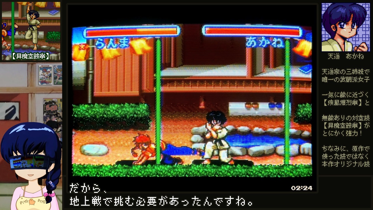 【天道あかね】との対戦でっす! <br /> <br><br><span style="color: #e69138;">//共通説明文てすと</span><br><span style="color: #ff00ff;"><strong>【New!】</strong></span>F-ZERO RTA:<a href="https://www.nicovideo.jp/watch/sm45660939" class="watch">sm45660939</a><br>【New!】Romancing Sa・Ga2:<a href="https://www.nicovideo.jp/watch/sm44400984" class="watch">sm44400984</a> <br>【New!】らんま½爆烈乱闘篇RTA (WR):<a href="https://www.nicovideo.jp/watch/sm44178414" class="watch">sm44178414</a>(デバイス制限対策版: <a href="https://www.nicovideo.jp/watch/sm44432134" class="watch">sm44432134</a>)<br>【New!】スーパーファミスタRTA:<a href="https://www.nicovideo.jp/watch/sm43890432" class="watch">sm43890432</a><br>【New!】ファミコンRTA落とし穴可視化用アイコン:<a href="https://seiga.nicovideo.jp/seiga/im11438499" target="_blank" rel="noopener">im11438499</a>(←5月23日以降に投稿したのは消えちゃったぽい...?)<br><br>【直撮り】ブラウン管テレビでファミコンする管理人さん:<a href="https://www.nicovideo.jp/series/423780" target="_blank" rel="noopener">series/423780</a><br>【ミンサガ】RTAとか:<a href="https://www.nicovideo.jp/series/416017" target="_blank" rel="noopener">series/416017</a><br>【WS版FF2】RTA:<a href="https://www.nicovideo.jp/series/426767" target="_blank" rel="noopener">series/426767</a><br>【DEAD OR ALIVE】RTA:<a href="https://www.nicovideo.jp/series/79228" target="_blank" rel="noopener">series/79228</a><br>【バブルボブル】RTA:<a href="https://www.nicovideo.jp/series/366167" target="_blank" rel="noopener">series/366167</a><br><span style="font-size: 14px;">【アーケードアーカイブス】</span>RTA:<a href="https://www.nicovideo.jp/series/79229" target="_blank" rel="noopener">series/79229</a>