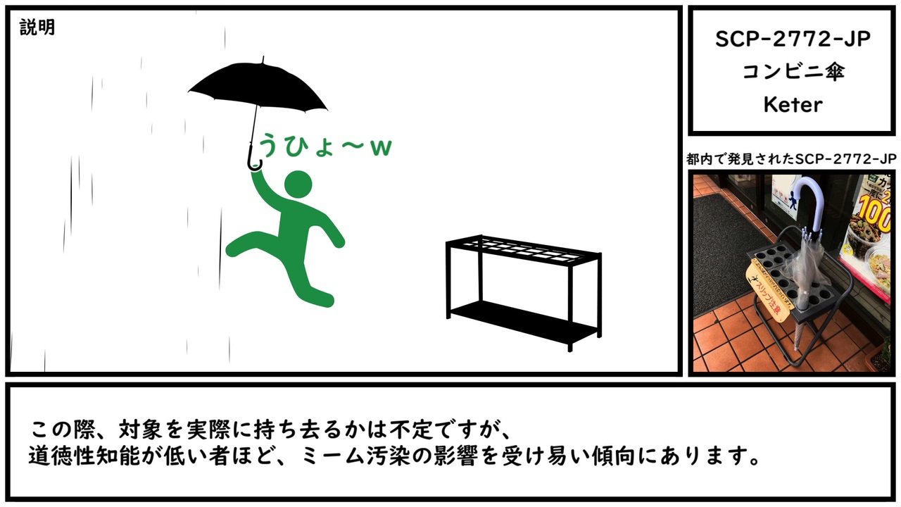 盗んでいいと思うから盗むんだ。<br><span style="color: #f3f3f3;">殴っていいと思うから殴るんだ。</span><br>本家記事 <a href="http://scp-jp.wikidot.com/scp-2772-jp" target="_blank" rel="noopener nofollow">http://scp-jp.wikidot.com/scp-2772-jp</a><br>作者 miyageubusuna<br>SCP財団 <a href="http://scp-jp.wikidot.com" target="_blank" rel="noopener nofollow">http://scp-jp.wikidot.com</a><br>過去の動画はこちら <a href="https://www.nicovideo.jp/mylist/67620202" target="_blank" rel="noopener">mylist/67620202</a><br>CC-BY-SA 3.0<br><span style="color: #f3f3f3;">【小ネタ】(著者ページより)「もちろん、傘で遊んだら危ないというのは子どもたちにもよく、指導をしていたのですけれど。」→「傘で遊んではいけない」ということを傘で殴って指導している。/「現在まで犯罪発生率および刑法犯認知件数に、有意な増加傾向は確認されていません。」→増加傾向が確認されることは、今後もないでしょう。ビニール傘なら仕方がないって、みんな思ってるんですから。</span>