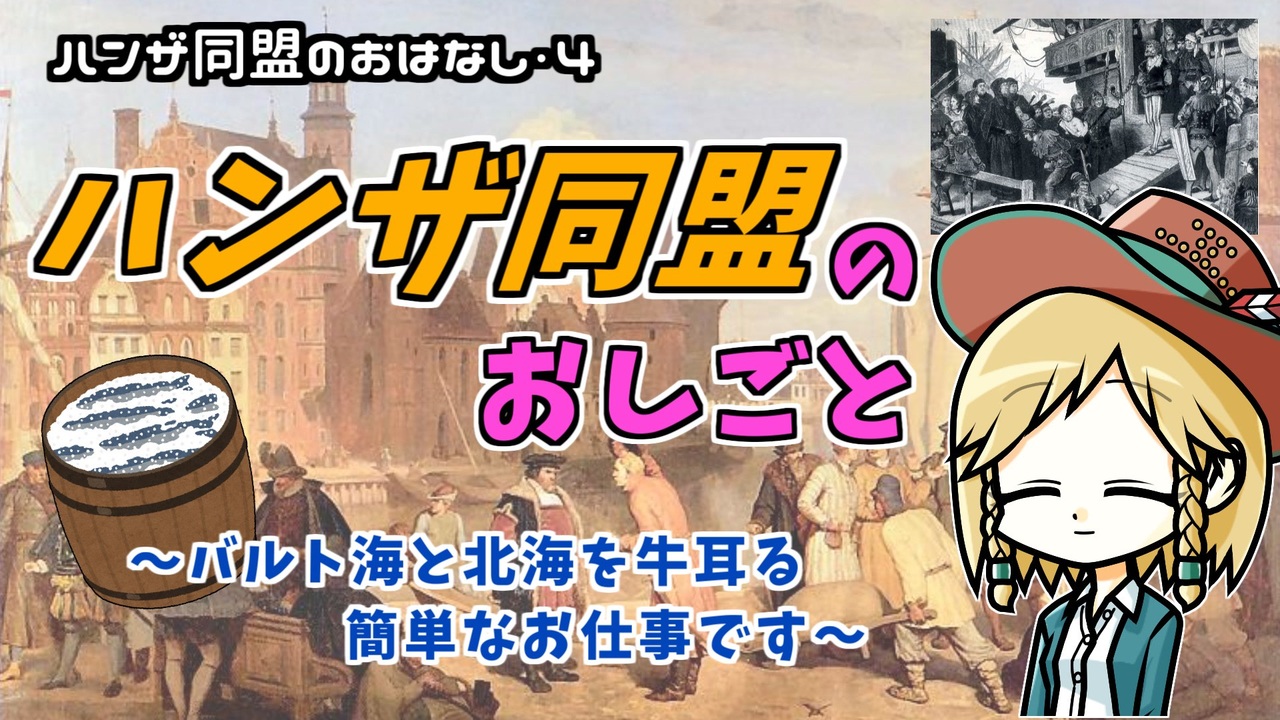 第1回→<a href="https://www.nicovideo.jp/watch/sm41279479" target="_blank" rel="noopener nofollow">https://www.nicovideo.jp/watch/sm41279479</a><br>第2回→<a href="https://www.nicovideo.jp/watch/sm41366591" target="_blank" rel="noopener nofollow">https://www.nicovideo.jp/watch/sm41366591</a><br>第3回→<a href="https://www.nicovideo.jp/watch/sm41447289" target="_blank" rel="noopener nofollow">https://www.nicovideo.jp/watch/sm41447289</a><br><br>ハンザ同盟の解説シリーズ第4回。全盛期のハンザがどんな感じで機能していたのかというお話です。<br><br><br>今回の参考文献:<br>高橋理(2013)『ハンザ「同盟」の歴史』創元社<br>アンリ・ピレンヌ(2018)『中世都市』佐々木克巳訳 講談社<br>河原温(1996)『世界史リブレット 中世ヨーロッパの都市世界』山川出版<br><br />━━━━━━━━━━━━━━━━━━━━━<br><br>この動画はクリエイティブ・コモンズ継承(CC-BY-SA)ライセンスの素材を使用して制作しています。(<a href="https://creativecommons.org/licenses/by-sa/4.0/)" target="_blank" rel="noopener nofollow">https://creativecommons.org/licenses/by-sa/4.0/)</a><br>規約に基づき、この動画もCC-BY-SA 4.0 のもとで公開します。<br><br>投稿者共通情報☆彡<br><br>BGM, SE:ニコニ・コモンズ様<br><a href="http://commons.nicovideo.jp/" target="_blank" rel="noopener nofollow">http://commons.nicovideo.jp/</a><br>魔王魂様<br><a href="https://maoudamashii.jokersounds.com/" target="_blank" rel="noopener nofollow">https://maoudamashii.jokersounds.com/</a><br>Audiostock様<br><a href="https://audiostock.jp/" target="_blank" rel="noopener nofollow">https://audiostock.jp/</a><br><br>立ち絵 霊夢・魔理沙(黒子式):nicotalk様<br><a href="http://www.nicotalk.com/charasozai.html" target="_blank" rel="noopener nofollow">http://www.nicotalk.com/charasozai.html</a><br><br>立ち絵 パトラ、マリー、アン、メアリ:ライフライフ様<br><a href="https://0801lifelife.tumblr.com/" target="_blank" rel="noopener nofollow">https://0801lifelife.tumblr.com/</a><br><br>使用ツール1:ゆっくりムービーメーカー4<br><a href="https://manjubox.net/ymm4/" target="_blank" rel="noopener nofollow">https://manjubox.net/ymm4/</a><br><br>使用ツール2:AviUtl<br><a href="http://spring-fragrance.mints.ne.jp/aviutl/" target="_blank" rel="noopener nofollow">http://spring-fragrance.mints.ne.jp/aviutl/</a><br><br>各時代の地図 : World History Maps & Timelines <br><a href="http://geacron.com/home-en/" target="_blank" rel="noopener nofollow">http://geacron.com/home-en/</a><br><br>ゆっくりボイスについて:AquesTalkライセンス取得済み<br><br>キャラクターボイス<br>アン・ボニー:羽ノ華(A.I.VOICE)<br>メアリ・リード:琴葉 葵(A.I.VOICE)<br>クレオパトラ:結月ゆかり(VOICEROID2)<br>マリー‐アントワネット:東北きりたん (VOICEROID EX)<br>その他キャラ:青山龍星(A.I.VOICE)、伊織弓鶴(A.I.VOICE2)、栗田まろん(A.I.VOICE)、宮舞モカ(VOICEPEAK)、フリモメン(VOICEPEAK)<br><br><br><br>その他フリー素材ご提供元の皆様に圧倒的感謝<br>