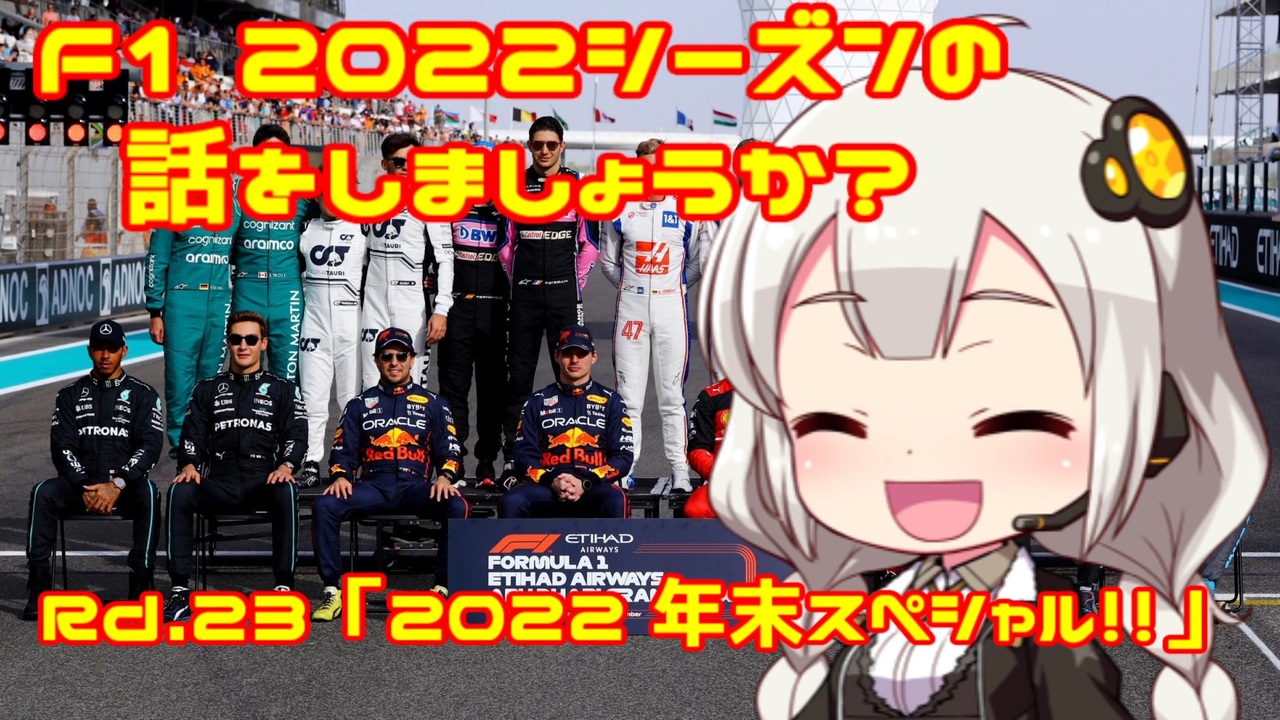 「最終回です。今年1年、たくさんのご視聴、コメント、広告、本当にありがとうございました!」by紲星あかり<br><br><br>おはこんばんちは、紲星あかりです。<br>この動画は、F1 2022年シーズンをダイジェストでお送りしています。<br>第23回目は昨年に引き続き、2022年のF1を振り返る「年末スペシャル」をお送りします。<br>今シーズンは新レギュレーションの導入でマシンの外観が大きく変化し、各GPで熱い戦いが展開され<br>レッドブルが9年ぶりのダブルタイトルを獲得!また、3年ぶりに日本GPが開催され、多くのF1ファンが鈴鹿に集った年でした!<br>フ◯テレビさんやDA◯Nさんの「F1総集編」に遠く及ばないレベルの動画になりますが、最後まで楽しんでいただければ幸いです。それでは皆さん、良いお年を!<br><br><br><br><br><br><span style="color: red;">(ご注意)この動画の情報は真実とは限りません。また、誤字・脱字が含まれる場合があります。ご了承ください。</span><br><br>前→第22戦・アブダビGP <a href="https://www.nicovideo.jp/watch/sm41421685" class="watch">sm41421685</a><br><br><br><br> <br>F12022シーズンの話をしましょうか?マイリスト→<a href="https://www.nicovideo.jp/mylist/72892585" target="_blank" rel="noopener">mylist/72892585</a><br><br>うp主のF1動画シリーズ<br>F12021シーズンの話をしましょうか?マイリスト→<a href="https://www.nicovideo.jp/mylist/70735663" target="_blank" rel="noopener">mylist/70735663</a><br>F12020シーズンの話をしましょうか?マイリスト→<a href="https://www.nicovideo.jp/mylist/67651731" target="_blank" rel="noopener">mylist/67651731</a> <br><span style="color: #000000; font-size: 14px;">F12019シーズンの話をしましょうか?マイリスト</span><span style="color: #000000; font-size: 13px;">→</span><a href="https://www.nicovideo.jp/mylist/64678414" target="_blank" rel="noopener">mylist/64678414</a><br><span style="color: #000000; font-size: 14px;">F12018シーズンの話をしましょうか?マイリスト</span><span style="color: #000000; font-size: 13px;">→</span><a href="https://www.nicovideo.jp/mylist/61514606" target="_blank" rel="noopener">mylist/61514606</a><br>F1の話をしましょうか?マイリスト→<a href="https://www.nicovideo.jp/mylist/40499353" target="_blank" rel="noopener">mylist/40499353</a><br>F1の話をしましょうか?OPフルバージョン→<a href="https://www.nicovideo.jp/mylist/59030210" target="_blank" rel="noopener">mylist/59030210</a><br>F1 CM集→<a href="https://www.nicovideo.jp/mylist/57297507" target="_blank" rel="noopener">mylist/57297507</a><br><br>