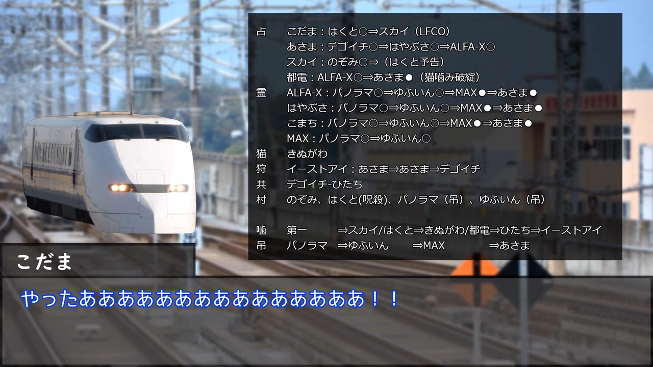 間に合ったか…?<br>間に合ったな…<br><br>17C猫FO 村1/占2/霊2/狩1/猫1/共2/狼4/狂2/狐2<br><br>Twitterで考察して頂ける方は#電車で人狼 を入れて呟いていただけると探しやすいです。<br>2日目⇒<a href="https://www.nicovideo.jp/watch/sm41360786" class="watch">sm41360786</a><br>5日目⇒<a href="https://www.nicovideo.jp/watch/sm41503921" class="watch">sm41503921</a> 8日目⇒<a href="https://www.nicovideo.jp/watch/sm41558845" class="watch">sm41558845</a> 12/27 10:30 投稿予定<br><br>電車で人狼!マイリスト <a href="https://www.nicovideo.jp/mylist/72946958" target="_blank" rel="noopener">mylist/72946958</a><br>電車で人狼! 支線編(解説動画) <a href="https://www.nicovideo.jp/mylist/79077747" target="_blank" rel="noopener">mylist/79077747</a><br>人狼動物園マイリスト <a href="https://www.nicovideo.jp/mylist/72986089" target="_blank" rel="noopener">mylist/72986089</a><br><br><a target="_blank" href="https://qa.nicovideo.jp/faq/show/19424?site_domain=default" style="font-size: 13px;color: #657586; text-decoration: underline; line-height: 1.4">この動画は投稿者によって修正されました</a>