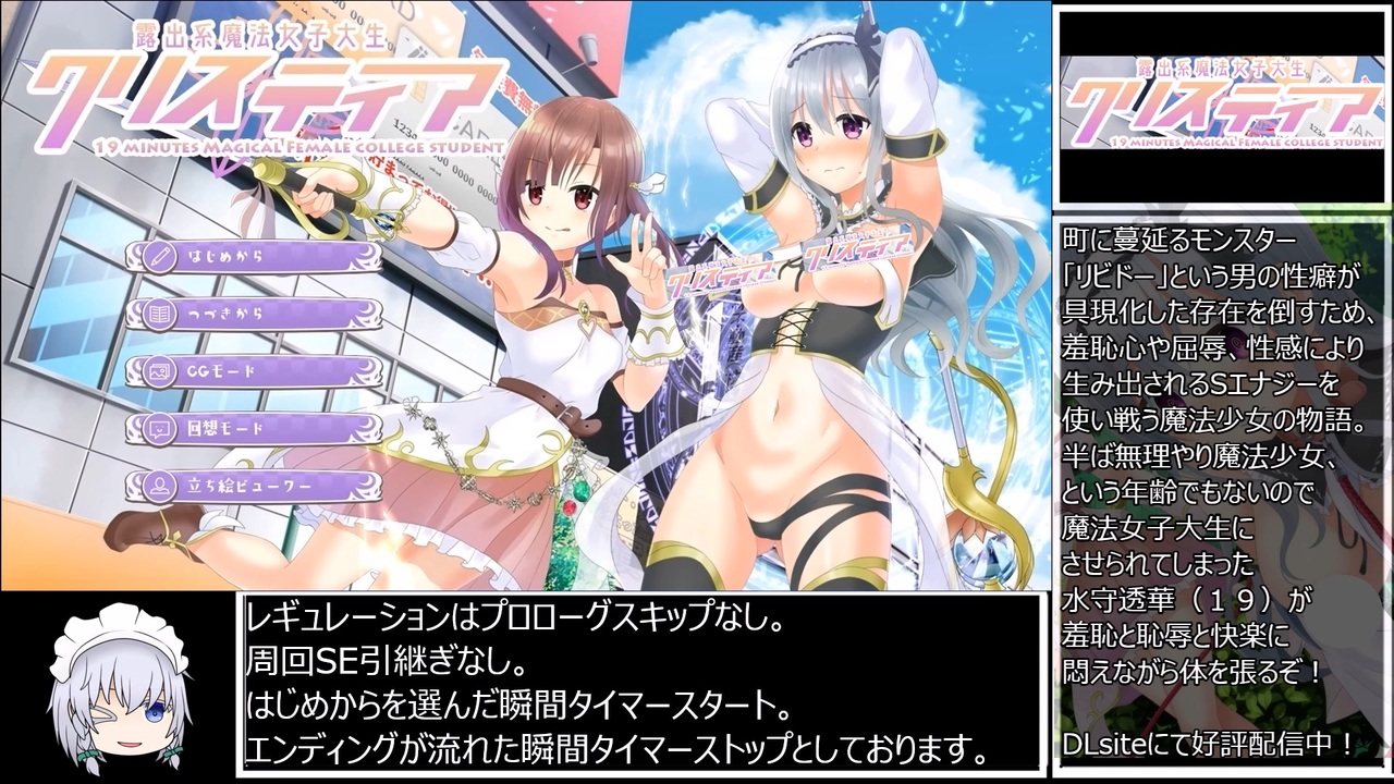 変身ヒロイン凌辱は一般性癖なので初投稿です。<br>(メリークリスマス!)<br><br><strong>【4H】</strong>様制作のR-18RPG<br><strong>【露出系魔法女子大生クリスティア】</strong><span style="font-size: 14px;">トゥルーエンド</span>RTAです。<br><br>レギュレーション<br>SE引継ぎなし<br>オープニングスキップなし<br>動画投稿許可済<br>計測開始:ニューゲームを選択した瞬間<br>計測終了:エンディングが流れた瞬間<br><br>次→ <a href="https://www.nicovideo.jp/watch/sm41579775" class="watch">sm41579775</a><br><br>クリスティアRTAマイリスト→<a href="https://www.nicovideo.jp/mylist/74233330" target="_blank" rel="noopener">mylist/74233330</a><br><br>パート1と単発のマイリスト→<a href="https://www.nicovideo.jp/mylist/70659794" target="_blank" rel="noopener">mylist/70659794</a><br><br>いいね欄で本動画で学んだ気付きを語っております<br><br>更新報告twitter:<a href="https://twitter.com/hihidowser" target="_blank" rel="noopener nofollow">https://twitter.com/hihidowser</a><br><br><br><br>スマホやタブレット等から見られない方はこちらの動画を参考にすると<br>見られるようになるはずです→ <a href="https://www.nicovideo.jp/watch/sm38575952" class="watch">sm38575952</a><br><br><br><br><strong>[露出系魔法少女シリーズ]の購入は下記サイトにて!<br>DLsite(PC)<br><br>作者様twitter:<a href="https://twitter.com/sitou44" target="_blank" rel="noopener nofollow">https://twitter.com/sitou44</a></strong><br>