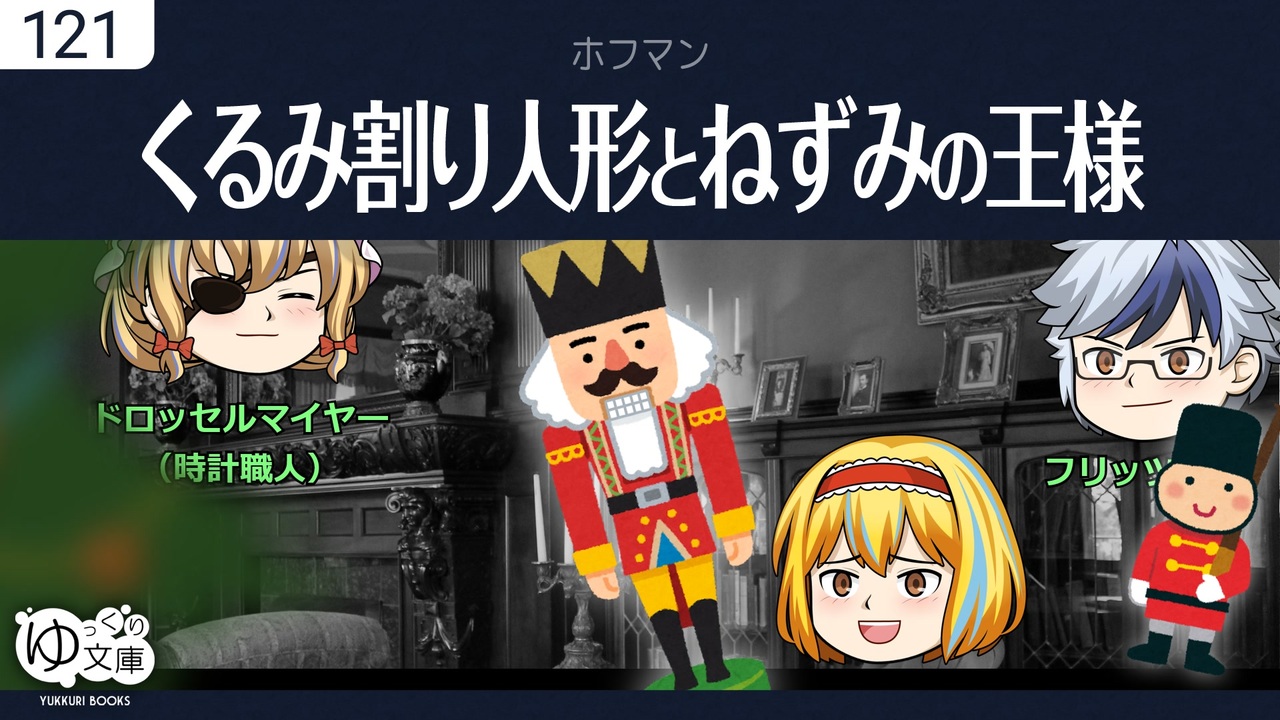 <span style="color: red;"><strong>121 それは少女の夢か?──</strong></span><br>クリスマス、マリーはドロッセルマイヤーおじさんから、くるみ割り人形をもらった。その夜、マリーの身体は小さくなって、凶悪なネズミたちに囲まれてしまう。そのとき...<br><span style="color: green;">Nussknacker und Mausekönig (1816) - E.T.A.Hoffmann</span><br><br>YouTube版:<a href="https://youtu.be/_WEnh5GGXtc" target="_blank" rel="noopener nofollow">https://youtu.be/_WEnh5GGXtc</a><br><br>(うp主より)<br>YMM4、HD画質、新素材での初投稿。<br>キャラ素材は安定せず。毎度デザインが変わってすまん。<br>編集後記に書きたいネタがあるが、次の過去作プレミアの手配しなければ。<br>YouTubeに先行プレミア公開したけど、新作は画面に集中してほしいから、意味なかった。新作の手応え、シーンごとの受け止め方、誤字脱字の指摘などは、ニコニコに軍配があがりそう。<br>よりよい作品を作りたいんだ。応援してくれ!<br><br>●クリスマス<br><a href="https://www.nicovideo.jp/watch/sm37689807" class="watch">sm37689807</a> クリスマス・エクスプレス:パロディCM<br><a href="https://youtu.be/XgdQKc17ms0" target="_blank" rel="noopener nofollow">https://youtu.be/XgdQKc17ms0</a> 青い紅玉<br><a href="https://youtu.be/Yl4tifS_WU0" target="_blank" rel="noopener nofollow">https://youtu.be/Yl4tifS_WU0</a> 賢者の贈り物<br><a href="https://www.nicovideo.jp/watch/sm41553797" class="watch">sm41553797</a> <span style="color: #ff00ff;"><strong>ホフマン「くるみ割り人形とねずみの王様」</strong></span><br><br>●ゆっくり文庫について<br>全部:<a href="https://www.nicovideo.jp/mylist/74874627" target="_blank" rel="noopener">mylist/74874627</a><br>近況:<a href="https://twitter.com/trynext" target="_blank" rel="noopener nofollow">https://twitter.com/trynext</a><br>---<br><br>訂正:聞き手(ぐぬぬ)