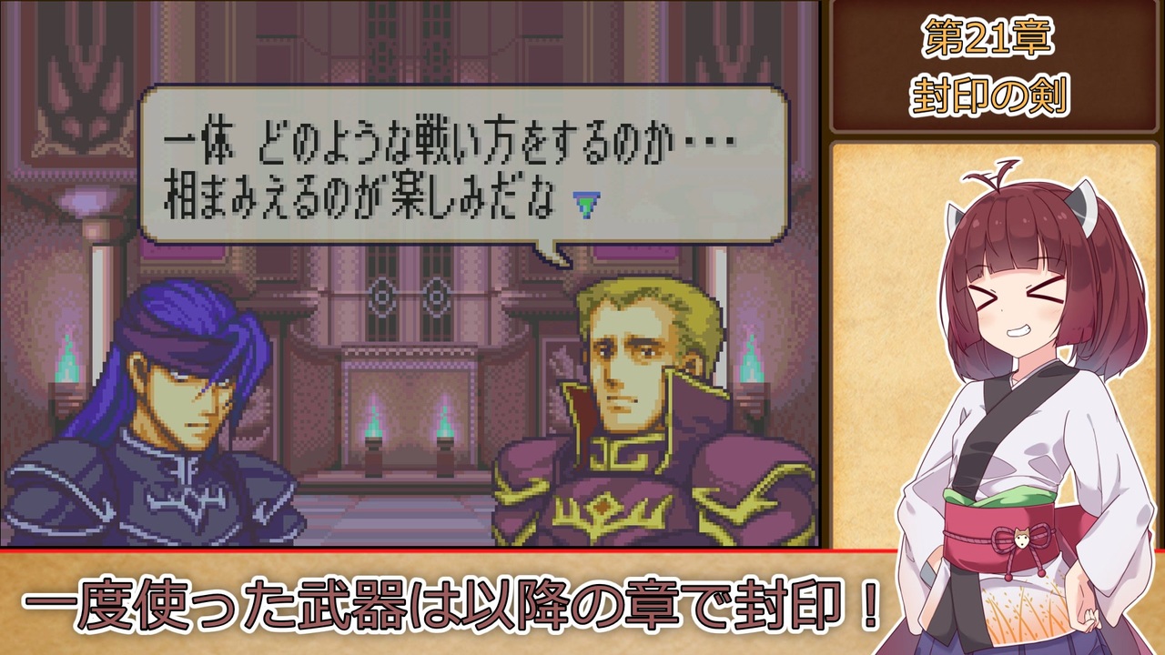 <span style="color: #85200c; font-size: 24px;"><strong><i>メリークリスマス!死ぬほど寒いですね!!</i></strong></span><br><br><strong>ルール1:一度使用した武器は、以降の章で使用する事を禁止する。<br>ルール2:武器の使用の定義は『その武器を装備した状態で敵との戦闘が発生したタイミング』『その武器を売却して換金した場合』杖の場合は『対象に対して使用した時点(命中の可否は問わない)』とする。<br>ルール3:難易度はハードとする。<br>ルール4:1章から終章まで全ての章を攻略し、仲間に出来るユニットは全員加入させ、生存させる。</strong><br><span style="color: #ff0000;"><strong>※ただしルート分岐次第で行けない章、加入出来ない仲間は除外。</strong></span><br><br>本動画のシリーズリスト【<a href="https://www.nicovideo.jp/series/316824" target="_blank" rel="noopener">series/316824</a>】<br>part1【<a href="https://www.nicovideo.jp/watch/sm40376370" class="watch">sm40376370</a>】<br>前:【<a href="https://www.nicovideo.jp/watch/sm41509641" class="watch">sm41509641</a>】次:【<a href="https://www.nicovideo.jp/watch/sm41561540" class="watch">sm41561540</a>】<br><br><strong>使用したソフト</strong><br>VOICEROID+東北きりたんEX<br>VOICEROID+東北ずん子EX<br>VOICEROID2 東北イタコ<br>VOICEVOX:ずんだもん<br><strong>お借りした立ち絵</strong><br>【<a href="https://seiga.nicovideo.jp/seiga/im10626877" target="_blank" rel="noopener">im10626877</a>】【<a href="https://seiga.nicovideo.jp/seiga/im10910197" target="_blank" rel="noopener">im10910197</a>】【<a href="https://seiga.nicovideo.jp/seiga/im10886085" target="_blank" rel="noopener">im10886085</a>】【<a href="https://seiga.nicovideo.jp/seiga/im10572401" target="_blank" rel="noopener">im10572401</a>】<br><strong>お借りした素材</strong><br>ニコニコモンズの皆様(コンテンツツリー参照)