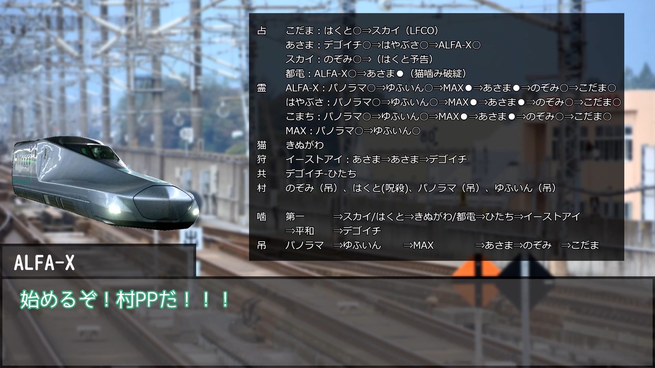 今日は劇場版シンカリオンが公開された日なんですよ。<br>初日に…観に行きましたね…。<br><br>17C猫FO 村1/占2/霊2/狩1/猫1/共2/狼4/狂2/狐2<br><br>Twitterで考察して頂ける方は#電車で人狼 を入れて呟いていただけると探しやすいです。<br>2日目⇒<a href="https://www.nicovideo.jp/watch/sm41360786" class="watch">sm41360786</a><br>6日目⇒<a href="https://www.nicovideo.jp/watch/sm41541906" class="watch">sm41541906</a> 反省会⇒<a href="https://www.nicovideo.jp/watch/sm41583422" class="watch">sm41583422</a><br><br>電車で人狼!マイリスト <a href="https://www.nicovideo.jp/mylist/72946958" target="_blank" rel="noopener">mylist/72946958</a><br>電車で人狼! 支線編(解説動画) <a href="https://www.nicovideo.jp/mylist/79077747" target="_blank" rel="noopener">mylist/79077747</a><br>人狼動物園マイリスト <a href="https://www.nicovideo.jp/mylist/72986089" target="_blank" rel="noopener">mylist/72986089</a>