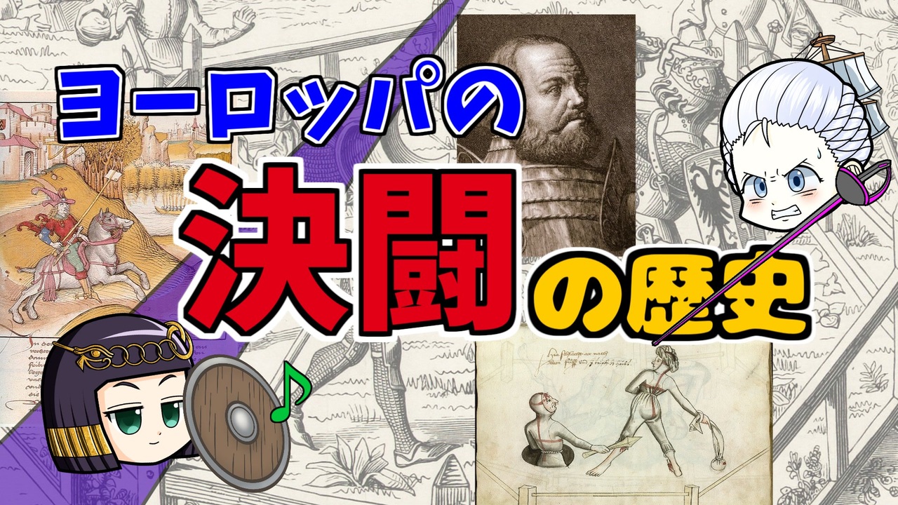 マリーは覚悟を決めたようです。<br><br>男も女も、軍人も政治家も裁判官もやっていた決闘。<br>今でいうとポケモンくらい経験者がいたとされる(適当)決闘についての歴史です。<br><br>今回の参考文献:<br>浜本隆志・菅野瑞治也(2021)『決闘のヨーロッパ史』河出書房新社<br>新星出版社編集部(2022)『ビジュアル図鑑 中世ヨーロッパ』新星出版社<br>高橋理(2013)『ハンザ「同盟」の歴史』創元社<br><br>その他 Wikipediaなど<br><br>twitter→<a href="https://twitter.com/mond_historica" target="_blank" rel="noopener nofollow">https://twitter.com/mond_historica</a><br />━━━━━━━━━━━━━━━━━━━━━<br><br>この動画はクリエイティブ・コモンズ継承(CC-BY-SA)ライセンスの素材を使用して制作しています。(<a href="https://creativecommons.org/licenses/by-sa/4.0/)" target="_blank" rel="noopener nofollow">https://creativecommons.org/licenses/by-sa/4.0/)</a><br>規約に基づき、この動画もCC-BY-SA 4.0 のもとで公開します。<br><br>投稿者共通情報☆彡<br><br>BGM, SE:ニコニ・コモンズ様<br><a href="http://commons.nicovideo.jp/" target="_blank" rel="noopener nofollow">http://commons.nicovideo.jp/</a><br>魔王魂様<br><a href="https://maoudamashii.jokersounds.com/" target="_blank" rel="noopener nofollow">https://maoudamashii.jokersounds.com/</a><br>Audiostock様<br><a href="https://audiostock.jp/" target="_blank" rel="noopener nofollow">https://audiostock.jp/</a><br><br>立ち絵 霊夢・魔理沙(黒子式):nicotalk様<br><a href="http://www.nicotalk.com/charasozai.html" target="_blank" rel="noopener nofollow">http://www.nicotalk.com/charasozai.html</a><br><br>立ち絵 パトラ、マリー、アン、メアリ:ライフライフ様<br><a href="https://0801lifelife.tumblr.com/" target="_blank" rel="noopener nofollow">https://0801lifelife.tumblr.com/</a><br><br>使用ツール1:ゆっくりムービーメーカー4<br><a href="https://manjubox.net/ymm4/" target="_blank" rel="noopener nofollow">https://manjubox.net/ymm4/</a><br><br>使用ツール2:AviUtl<br><a href="http://spring-fragrance.mints.ne.jp/aviutl/" target="_blank" rel="noopener nofollow">http://spring-fragrance.mints.ne.jp/aviutl/</a><br><br>各時代の地図 : World History Maps & Timelines <br><a href="http://geacron.com/home-en/" target="_blank" rel="noopener nofollow">http://geacron.com/home-en/</a><br><br>ゆっくりボイスについて:AquesTalkライセンス取得済み<br><br>キャラクターボイス<br>アン・ボニー:羽ノ華(A.I.VOICE)<br>メアリ・リード:琴葉 葵(A.I.VOICE)<br>クレオパトラ:結月ゆかり(VOICEROID2)<br>マリー‐アントワネット:東北きりたん (VOICEROID EX)<br>その他キャラ:青山龍星(A.I.VOICE)、伊織弓鶴(A.I.VOICE2)、栗田まろん(A.I.VOICE)、宮舞モカ(VOICEPEAK)、フリモメン(VOICEPEAK)<br><br><br><br>その他フリー素材ご提供元の皆様に圧倒的感謝<br>