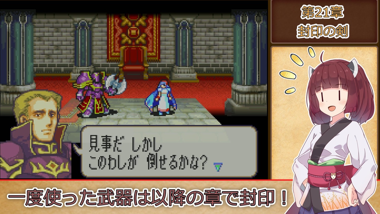 <span style="color: #85200c; font-size: 24px;"><strong><i>リメイクとか出たらゲイル仲間になんないかな…</i></strong></span><br><br><strong>ルール1:一度使用した武器は、以降の章で使用する事を禁止する。<br>ルール2:武器の使用の定義は『その武器を装備した状態で敵との戦闘が発生したタイミング』『その武器を売却して換金した場合』杖の場合は『対象に対して使用した時点(命中の可否は問わない)』とする。<br>ルール3:難易度はハードとする。<br>ルール4:1章から終章まで全ての章を攻略し、仲間に出来るユニットは全員加入させ、生存させる。</strong><br><span style="color: #ff0000;"><strong>※ただしルート分岐次第で行けない章、加入出来ない仲間は除外。</strong></span><br><br>本動画のシリーズリスト【<a href="https://www.nicovideo.jp/series/316824" target="_blank" rel="noopener">series/316824</a>】<br>part1【<a href="https://www.nicovideo.jp/watch/sm40376370" class="watch">sm40376370</a>】<br>前:【<a href="https://www.nicovideo.jp/watch/sm41554276" class="watch">sm41554276</a>】次:【<a href="https://www.nicovideo.jp/watch/sm41622424" class="watch">sm41622424</a>】<br><br><strong>使用したソフト</strong><br>VOICEROID+東北きりたんEX<br>VOICEROID+東北ずん子EX<br>VOICEROID2 東北イタコ<br>VOICEVOX:ずんだもん<br><strong>お借りした立ち絵</strong><br>【<a href="https://seiga.nicovideo.jp/seiga/im10626877" target="_blank" rel="noopener">im10626877</a>】【<a href="https://seiga.nicovideo.jp/seiga/im10910197" target="_blank" rel="noopener">im10910197</a>】【<a href="https://seiga.nicovideo.jp/seiga/im10886085" target="_blank" rel="noopener">im10886085</a>】【<a href="https://seiga.nicovideo.jp/seiga/im10572401" target="_blank" rel="noopener">im10572401</a>】<br><strong>お借りした素材</strong><br>ニコニコモンズの皆様(コンテンツツリー参照)<br />VOICEVOXホームページ:<a href="https://voicevox.hiroshiba.jp/" target="_blank" rel="noopener nofollow">https://voicevox.hiroshiba.jp/</a><br>編集ソフト :YMM4<br>投稿動画part1まとめマイリスト:<a href="https://www.nicovideo.jp/mylist/72070653" target="_blank" rel="noopener">mylist/72070653</a><br>あまり喋らないツイッター:<a href="https://twitter.com/titeinotami" target="_blank" rel="noopener nofollow">https://twitter.com/titeinotami</a>