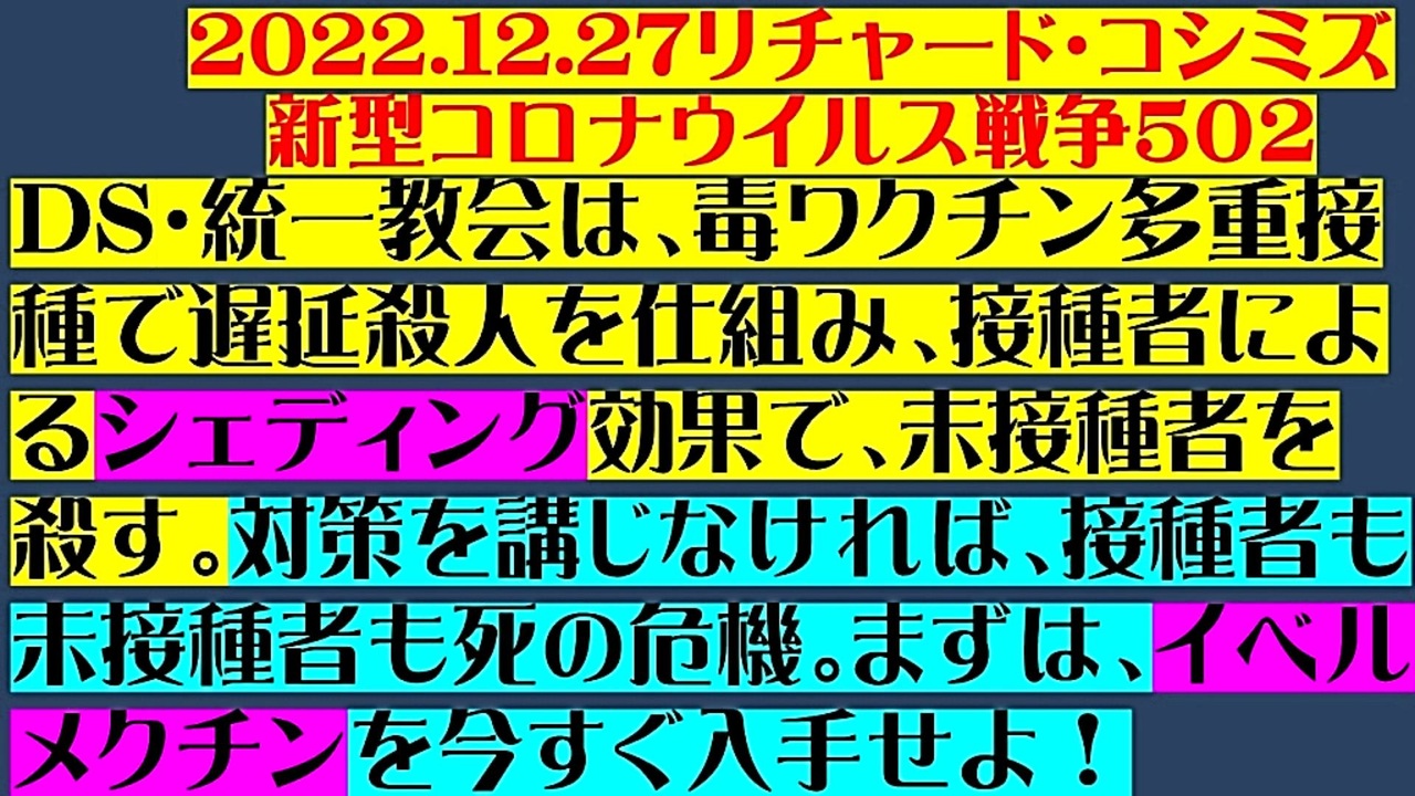 <span style="color: #cc4125;"><strong>「 テーマ:新型コロナウイルス戦争 502 」</strong></span><br><br><span style="color: #ff0000;"><strong>「『 DEEP STATE・統一教会 』は、『 毒ワクチン多重接種 』で『 遅延殺人 』を仕組み、『 ワクチン接種<br> 者 』による『 シェディング効果 』で、『 ワクチン未接種者を殺す 』。<br> 『 対策 』を講じなければ、『 ワクチン接種者 』も『 ワクチン未接種者 』も『 死の危機 』。<br> まずは、『 イベルメクチン 』を今すぐ入手せよ! 」</strong></span><br><br><span style="color: #0000ff;"><strong>「『 イベルメクチン・アビガン・その他コロナ対策 』についてのご意見をお寄せ下さい! 」<br><br> ◐ E-mail:richardkoshimizu@gmail.com</strong></span><br><br><strong>◐「クリエイターサポート」・「フォロー」・「ニコニ広告」等、是非ともご協力下さい。リチャード・コシミズ</strong><br><br><span style="color: #38761d;"><strong>◐リチャード・コシミズ 講演会 公式 動画ギャラリー</strong></span><br> <a href="http://www.t-sskk.com/richardkoshimizu/video-gallery/index.html" target="_blank" rel="noopener nofollow">http://www.t-sskk.com/richardkoshimizu/video-gallery/index.html</a><br><br><span style="color: #38761d;"><strong>◐リチャード・コシミズ 講演会 ニコニコ生放送 LIVE</strong></span><br> <a href="https://bit.ly/3Bx8F5w" target="_blank" rel="noopener nofollow">https://bit.ly/3Bx8F5w</a><br><br><span style="color: #38761d;"><strong>◐リチャード・コシミズ 公式 ブログ</strong></span><br> <a href="http://08054623210.jugem.jp/" target="_blank" rel="noopener nofollow">http://08054623210.jugem.jp/</a><br><br><span style="color: #38761d;"><strong>◐リチャード・コシミズ 公式 ホームページ<br> </strong></span><a href="http://richardkoshimizu.boo.jp/" target="_blank" rel="noopener nofollow">http://richardkoshimizu.boo.jp/</a><br><br><span style="color: #38761d;"><strong>◐リチャード・コシミズ 公式 Twitter</strong></span><br> <a href="https://twitter.com/rickoshimizu" target="_blank" rel="noopener nofollow">https://twitter.com/rickoshimizu</a><br>