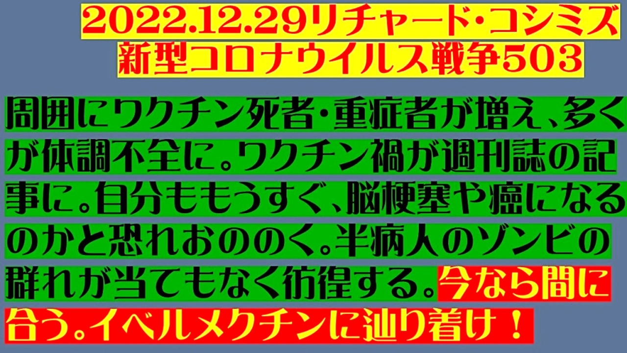 <span style="color: #cc4125;"><strong>「 テーマ:新型コロナウイルス戦争 503 」</strong></span><br><br><span style="color: #ff0000;"><strong>「 周囲に『 ワクチン死者・重症者 』が増え、多くが『 体調不全 』に。『 ワクチン禍 』が『 週刊誌の記事 』<br> に。『 自分 』ももうすぐ、『 脳梗塞や癌 』になるのかと『 恐れおののく 』。<br> 『 半病人のゾンビ 』の『 群れ 』が当てもなく『 彷徨 』する。『 今なら間に合う! 』、『 イベルメクチ<br> ン 』に辿り着け!」</strong></span><br><br><span style="color: #0000ff;"><strong>「『 イベルメクチン・アビガン・その他コロナ対策 』についてのご意見をお寄せ下さい! 」<br><br> ◐ E-mail:richardkoshimizu@gmail.com</strong></span><br><br><strong>◐「クリエイターサポート」・「フォロー」・「ニコニ広告」等、是非ともご協力下さい。リチャード・コシミズ</strong><br><br><span style="color: #38761d;"><strong>◐リチャード・コシミズ 講演会 公式 動画ギャラリー</strong></span><br> <a href="http://www.t-sskk.com/richardkoshimizu/video-gallery/index.html" target="_blank" rel="noopener nofollow">http://www.t-sskk.com/richardkoshimizu/video-gallery/index.html</a><br><br><span style="color: #38761d;"><strong>◐リチャード・コシミズ 講演会 ニコニコ生放送 LIVE</strong></span><br> <a href="https://bit.ly/3Bx8F5w" target="_blank" rel="noopener nofollow">https://bit.ly/3Bx8F5w</a><br><br><span style="color: #38761d;"><strong>◐リチャード・コシミズ 公式 ブログ</strong></span><br> <a href="http://08054623210.jugem.jp/" target="_blank" rel="noopener nofollow">http://08054623210.jugem.jp/</a><br><br><span style="color: #38761d;"><strong>◐リチャード・コシミズ 公式 ホームページ<br> </strong></span><a href="http://richardkoshimizu.boo.jp/" target="_blank" rel="noopener nofollow">http://richardkoshimizu.boo.jp/</a><br><br><span style="color: #38761d;"><strong>◐リチャード・コシミズ 公式 Twitter</strong></span><br> <a href="https://twitter.com/rickoshimizu" target="_blank" rel="noopener nofollow">https://twitter.com/rickoshimizu</a><br>
