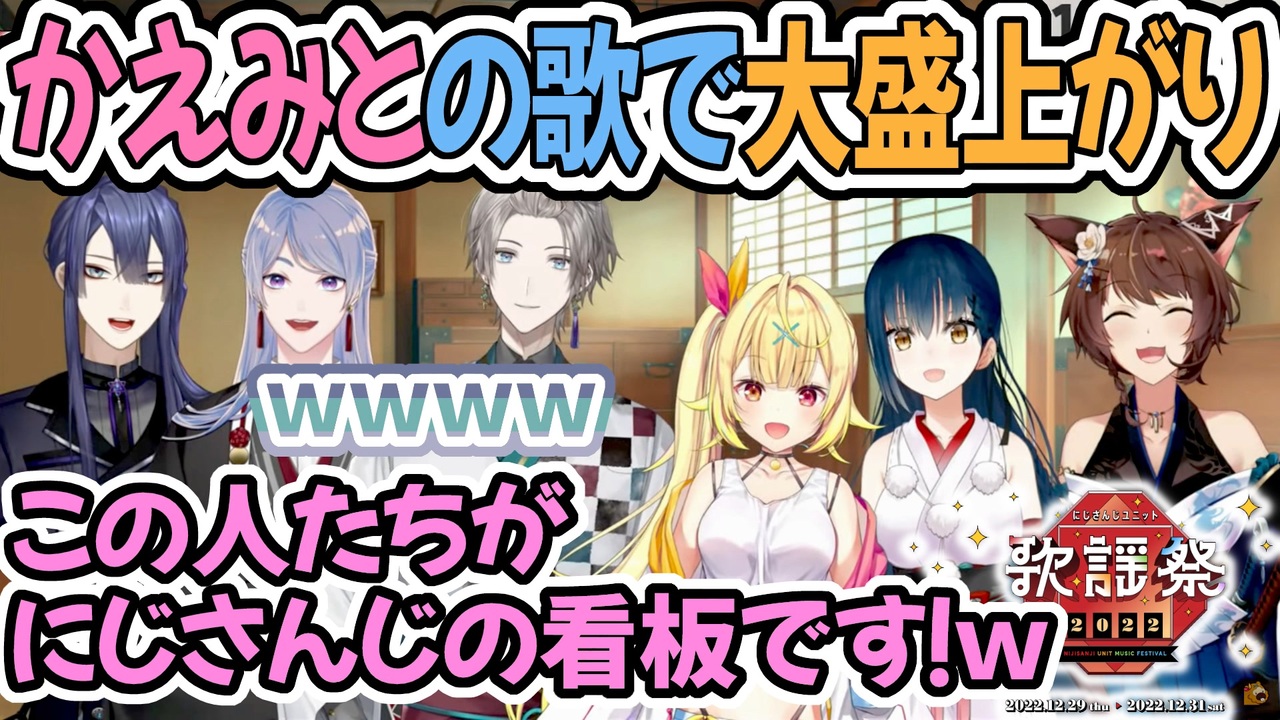 にじステーションです<br><br><br>切り抜き始めて丸2カ月経ちましたが、そこそこ頑張れたのではと思います<br>ミスは多いですが、しっかり検閲もしつつの、<br>新年も満喫しつつ、頑張って切り抜いていこうと思います。<br>早い内から挨拶しとこうということで有難うございました。<br><br><br><br>Youtubeチャンネル <br>つべがメインかつ動画アップとサムネの手間があるのでYoutubeの方が投稿早め<br><a href="https://www.youtube.com/@2434STATION" target="_blank" rel="noopener nofollow">https://www.youtube.com/@2434STATION</a><br><br><br><span style="color: #cc0000; font-size: 16px;"><strong>元配信</strong></span><span style="color: #cc0000;"> </span> <br>にじさんじ歌謡祭2022 DAY1を皆で同時視聴する!【にじさんじ/星川サラ/フミ/山神カルタ/長尾景/弦月藤士郎/甲斐田晴】<br><a href="https://youtu.be/HCtBjFTvcBI" target="_blank" rel="noopener nofollow">https://youtu.be/HCtBjFTvcBI</a><br><br><br>以下よりDAY1のタイムシフトをご覧いただけます <br>2:08:20ごろから始まります<br><a href="https://live.nicovideo.jp/watch/lv338568592" target="_blank" rel="noopener nofollow">https://live.nicovideo.jp/watch/lv338568592</a><br><br><br><span style="color: #0000ff;"><strong>タイムスタンプ</strong></span><br><br><br>使用SE<br><a href="https://otologic.jp/free/se/motion-pop02.html" target="_blank" rel="noopener nofollow">https://otologic.jp/free/se/motion-pop02.html</a><br>