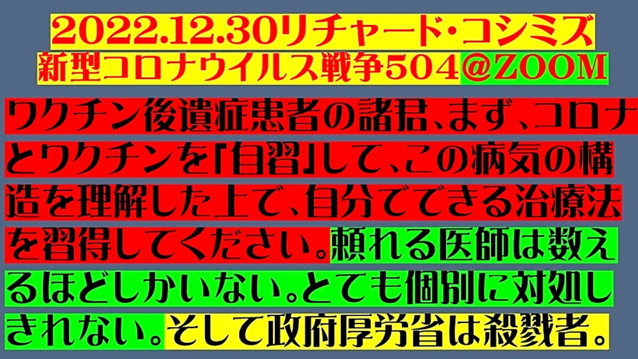 <span style="color: #cc4125;"><strong>「 テーマ:新型コロナウイルス戦争 504 @ ZOOM 」</strong></span><br><br><span style="color: #ff0000;"><strong>「『 ワクチン後遺症患者 』の諸君、まず、『 コロナ 』と『 ワクチン 』を『 自習 』して、<br> この『 病気の構造 』を理解した上で、『 自分 』でできる『 治療法 』を『 習得 』して下さい。<br> 『 頼れる医師 』は、『 数えるほどしかいない 』。とても、個別に『 対処しきれない 』。<br> そして、『 政府・厚生労働省 』は『 殺戮者 』。<br> 『 ワクチン後遺症患者 』の皆さん、『 お医者さん 』も『 国 』も『 助けてはくれない 』。<br> このままでは、『 死ぬ 』か『 廃人 』です。『 病状 』は、待っていても『 よくはならない 』。<br> 『 助かる方法・改善法 』はある。ここで解説します 」</strong></span><br><br><strong>*諸事情により、「暫定版」とさせて頂きます。「改良版」は、後日、アップ致します。ご了承下さい。</strong><br><br><span style="color: #0000ff;"><strong>「『 イベルメクチン・アビガン・その他コロナ対策 』についてのご意見をお寄せ下さい! 」<br><br> ◐ E-mail:richardkoshimizu@gmail.com</strong></span><br><br><strong>◐「クリエイターサポート」・「フォロー」・「ニコニ広告」等、是非ともご協力下さい。リチャード・コシミズ</strong><br><br><span style="color: #38761d;"><strong>◐リチャード・コシミズ 講演会 公式 動画ギャラリー</strong></span><br> <a href="http://www.t-sskk.com/richardkoshimizu/video-gallery/index.html" target="_blank" rel="noopener nofollow">http://www.t-sskk.com/richardkoshimizu/video-gallery/index.html</a><br><br><span style="color: #38761d;"><strong>◐リチャード・コシミズ 講演会 ニコニコ生放送 LIVE</strong></span><br> <a href="https://bit.ly/3Bx8F5w" target="_blank" rel="noopener nofollow">https://bit.ly/3Bx8F5w</a><br><br><span style="color: #38761d;"><strong>◐リチャード・コシミズ 公式 ブログ</strong></span><br> <a href="http://08054623210.jugem.jp/" target="_blank" rel="noopener nofollow">http://08054623210.jugem.jp/</a><br>