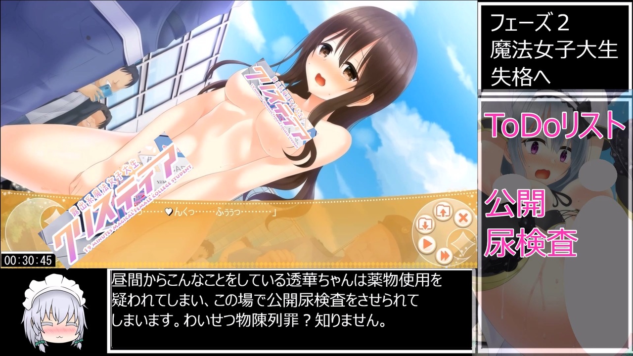 明けましておめでとうございます。<br>謹んで新年の露出を申し上げます。<br><br><strong>【4H】</strong>様制作のR-18RPG<br><strong>【露出系魔法女子大生クリスティア】</strong><span style="font-size: 14px;">トゥルーエンド</span>RTAです。<br><br>レギュレーション<br>SE引継ぎなし<br>オープニングスキップなし<br>動画投稿許可済<br>計測開始:ニューゲームを選択した瞬間<br>計測終了:エンディングが流れた瞬間<br><br><a href="https://www.nicovideo.jp/watch/sm41545665" class="watch">sm41545665</a>←前 次→ <a href="https://www.nicovideo.jp/watch/sm41606739" class="watch">sm41606739</a><br><br>クリスティアRTAマイリスト→<a href="https://www.nicovideo.jp/mylist/74233330" target="_blank" rel="noopener">mylist/74233330</a><br><br>パート1と単発のマイリスト→<a href="https://www.nicovideo.jp/mylist/70659794" target="_blank" rel="noopener">mylist/70659794</a><br><br>いいね欄でこの動画に込めた思いを語りました。<br><br>更新報告twitter:<a href="https://twitter.com/hihidowser" target="_blank" rel="noopener nofollow">https://twitter.com/hihidowser</a><br><br><br><br>スマホやタブレット等から見られない方はこちらの動画を参考にすると<br>見られるようになるはずです→ <a href="https://www.nicovideo.jp/watch/sm38575952" class="watch">sm38575952</a><br><br><br><br><strong>[露出系魔法少女シリーズ]の購入は下記サイトにて!<br>DLsite(PC)<br><br>作者様twitter:<a href="https://twitter.com/sitou44" target="_blank" rel="noopener nofollow">https://twitter.com/sitou44</a></strong><br>