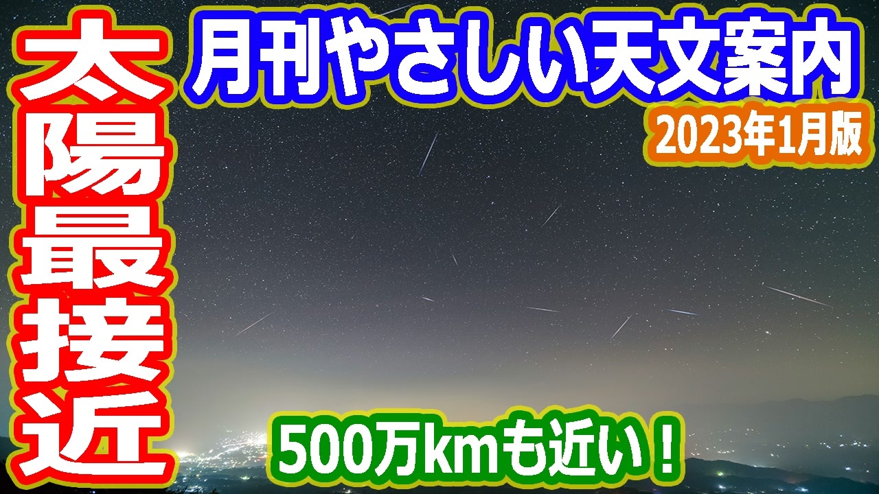 【もしも地球の自転が止まったら】<br><a href="https://www.nicovideo.jp/watch/sm31017811" target="_blank" rel="noopener nofollow">https://www.nicovideo.jp/watch/sm31017811</a><br>明けましておめでとうございます<br>2022年はたくさんの方に支援と応援して頂いたおかげで宇宙解説を続けることができました<br>2023年も引き続きがんばっていきますので、よろしくお願いします<br>今回は地球が太陽に最接近する仕組みと、しぶんぎ座流星群の観測条件<br>惑星同士のみかけ上の接近や月との接近を解説します<br><br>【欲しいものリスト】<br><a href="https://www.amazon.jp/hz/wishlist/ls/30HG3KS6HM6G?ref_=wl_share" target="_blank" rel="noopener nofollow">https://www.amazon.jp/hz/wishlist/ls/30HG3KS6HM6G?ref_=wl_share</a><br>【いちおし宇宙系】<br>・アマゾン総合リンク<br><a href="https://amzn.to/2S8xjpH" target="_blank" rel="noopener nofollow">https://amzn.to/2S8xjpH</a><br>・レゴ(LEGO)アイデア レゴ(R) NASA アポロ計画 サターンV<br><a href="https://amzn.to/3xx5QAf" target="_blank" rel="noopener nofollow">https://amzn.to/3xx5QAf</a><br>・LEGO レゴ クリエイターエキスパート 10266 NASA アポロ11号 月着陸船<br><a href="https://amzn.to/3EpM3nV" target="_blank" rel="noopener nofollow">https://amzn.to/3EpM3nV</a><br>・月をめざした二人の科学者 アポロとスプートニクの軌跡<br>kindle版<br><a href="https://amzn.to/3OvBftd" target="_blank" rel="noopener nofollow">https://amzn.to/3OvBftd</a><br>書籍版<br><a href="https://amzn.to/390wWWn" target="_blank" rel="noopener nofollow">https://amzn.to/390wWWn</a><br>公平性や中立性を考えてアフィリエイトリンクは控えていましたが、得た収益を次のレビュー書籍や機材代にするために始めました<br>よろしくお願いします<br>へえ~と思ったらチャンネル登録と高評価をお願います<br>ツイッターでは、たまに宇宙ネタをつぶやいています<br><br>◆チャンネル登録はこちら<br><a href="http://www.youtube.com/channel/UChOv-TZWg3X4MDjFUF8CfQg?sub_confirmation=1" target="_blank" rel="noopener nofollow">http://www.youtube.com/channel/UChOv-TZWg3X4MDjFUF8CfQg?sub_confirmation=1</a><br>◆サブチャンネル<br><a href="http://www.youtube.com/channel/UCpQEOLtOpmXUwslvgi93yQw?sub_confirmation=1" target="_blank" rel="noopener nofollow">http://www.youtube.com/channel/UCpQEOLtOpmXUwslvgi93yQw?sub_confirmation=1</a><br>◆twitterはこちら<br><a href="https://twitter.com/skysanpei" target="_blank" rel="noopener nofollow">https://twitter.com/skysanpei</a>