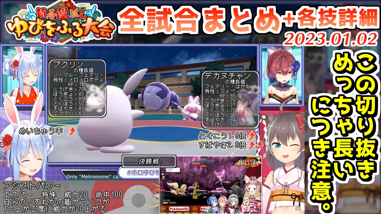 画質はオレが置いてきた<br><br><a href="#" class="seekTime" data-seekTime="00:00" onclick="seekNicoPlayer('#00:00'); return false;">#00:00</a> ルール<br><a href="#" class="seekTime" data-seekTime="00:15" onclick="seekNicoPlayer('#00:15'); return false;">#00:15</a> 第1回戦 1試合目 すいせいVSいろは<br><a href="#" class="seekTime" data-seekTime="02:55" onclick="seekNicoPlayer('#02:55'); return false;">#02:55</a> 第1回戦 2試合目 ロボ子VSノエル<br><a href="#" class="seekTime" data-seekTime="06:48" onclick="seekNicoPlayer('#06:48'); return false;">#06:48</a> 第1回戦 3試合目 ぺこらVSころね<br><a href="#" class="seekTime" data-seekTime="09:59" onclick="seekNicoPlayer('#09:59'); return false;">#09:59</a> 第1回戦 4試合目 こよりVSちょこ<br><a href="#" class="seekTime" data-seekTime="15:00" onclick="seekNicoPlayer('#15:00'); return false;">#15:00</a> 第1回戦 5試合目 アキロゼVSクロヱ<br><a href="#" class="seekTime" data-seekTime="19:44" onclick="seekNicoPlayer('#19:44'); return false;">#19:44</a> 第1回戦 6試合目 ポルカVSフブキ<br><a href="#" class="seekTime" data-seekTime="22:00" onclick="seekNicoPlayer('#22:00'); return false;">#22:00</a> 第1回戦 7試合目 おかゆVSルイ<br><a href="#" class="seekTime" data-seekTime="23:08" onclick="seekNicoPlayer('#23:08'); return false;">#23:08</a> 第1回戦 8試合目 まつりVSわため<br><a href="#" class="seekTime" data-seekTime="24:15" onclick="seekNicoPlayer('#24:15'); return false;">#24:15</a> 第2回戦 1試合目 すいせいVSロボ子<br><a href="#" class="seekTime" data-seekTime="26:44" onclick="seekNicoPlayer('#26:44'); return false;">#26:44</a> 第2回戦 2試合目 ぺこらVSちょこ<br><a href="#" class="seekTime" data-seekTime="33:41" onclick="seekNicoPlayer('#33:41'); return false;">#33:41</a> 第2回戦 3試合目 アキVSポルカ<br><a href="#" class="seekTime" data-seekTime="35:40" onclick="seekNicoPlayer('#35:40'); return false;">#35:40</a> 第2回戦 4試合目 おかゆVSまつり<br><a href="#" class="seekTime" data-seekTime="39:42" onclick="seekNicoPlayer('#39:42'); return false;">#39:42</a> 準決勝 1試合目 ロボ子VSぺこら<br><a href="#" class="seekTime" data-seekTime="41:44" onclick="seekNicoPlayer('#41:44'); return false;">#41:44</a> 準決勝 2試合目 アキVSまつり<br><a href="#" class="seekTime" data-seekTime="45:03" onclick="seekNicoPlayer('#45:03'); return false;">#45:03</a> 決勝戦 ぺこらVSまつり<br><br>元動画様はこちら<br>【#ホロゆびをふる】新春運試し!!ゆびをふる大会2023!!!!!!!【兎田ぺこら】<br><a href="https://youtu.be/UHXSfWeA1iE" target="_blank" rel="noopener nofollow">https://youtu.be/UHXSfWeA1iE</a><br><br>PokemonゆびをふるたいかいWIN【尾丸ポルカ】<br><a href="https://youtu.be/H4kYGV2CqvM" target="_blank" rel="noopener nofollow">https://youtu.be/H4kYGV2CqvM</a><br><br>今年の運試しいってみよ~!!!【ロボ子さん】<br><a href="https://youtu.be/BklFCcGJoXU" target="_blank" rel="noopener nofollow">https://youtu.be/BklFCcGJoXU</a><br><br>ホロゆびをふる まさかの準決勝で枠をとる【アキ・ローゼンタール】<br><a href="https://youtu.be/Df-4paUusGo" target="_blank" rel="noopener nofollow">https://youtu.be/Df-4paUusGo</a><br><br>ポットデスとこのゆびふりを終わらせに来た!!!ドンッ【白上フブキ】<br><a href="https://youtu.be/oX6EzVIaSfc" target="_blank" rel="noopener nofollow">https://youtu.be/oX6EzVIaSfc</a><br><br>最近めちゃ運がイイと噂の脳筋女騎士【白銀ノエル】<br><a href="https://youtu.be/CkoJTcqIqkE" target="_blank" rel="noopener nofollow">https://youtu.be/CkoJTcqIqkE</a><br><br>負けたら試合終了!初めてのゆびをふる参戦!!!【角巻わため】<br><a href="https://youtu.be/rx-8aKvBNT0" target="_blank" rel="noopener nofollow">https://youtu.be/rx-8aKvBNT0</a><br><br>運試し!色違いパワーで優勝掴むぞ!!!【博衣こより】<br><a href="https://youtu.be/-IgAgwjU6CM" target="_blank" rel="noopener nofollow">https://youtu.be/-IgAgwjU6CM</a><br><br>目指すは2連覇。今年も自爆へ誘うゆびふりで勝利を決める。【鷹嶺ルイ】<br><a href="https://youtu.be/w5b7jyc6ttQ" target="_blank" rel="noopener nofollow">https://youtu.be/w5b7jyc6ttQ</a><br><br>豪運!?ゆびをふりまわすでござる【風真いろは】<br><a href="https://youtu.be/k2kWGHezDjI" target="_blank" rel="noopener nofollow">https://youtu.be/k2kWGHezDjI</a><br /><span style="color: #b7b7b7; font-size: 10px;">ホロライブ切り抜き/なめたけ <a href="https://t.co/CBwJLnYR2c" target="_blank" rel="noopener nofollow">https://t.co/CBwJLnYR2c</a></span>