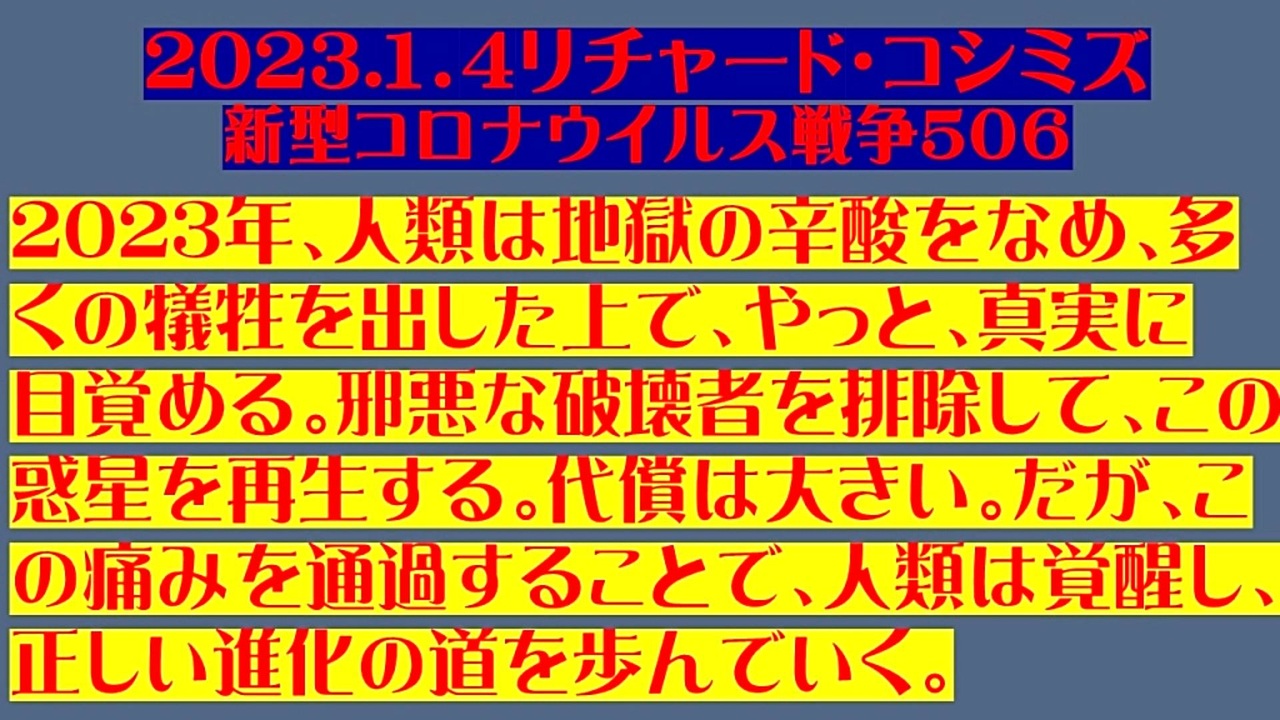 <span style="color: #cc4125;"><strong>「 テーマ:新型コロナウイルス戦争 506 」</strong></span><br><br><span style="color: #ff0000;"><strong>「 2023年、『 人類 』は『 地獄 』の『 辛酸 』をなめ、多くの『 犠牲 』を出した上で、やっと、<br> 『 真実 』に『 目覚める 』。<br> 『 邪悪な破壊者 』を『 排除 』して、この『 惑星 』を『 再生 』する。『 代償は大きい 』。<br> だが、この『 痛み 』を『 通過 』することで、『 人類 』は『 覚醒 』し、 『 正しい進化の道 』を<br> 歩んでいく 」</strong></span><br><br><span style="color: #0000ff;"><strong>「『 イベルメクチン・アビガン・その他コロナ対策 』について、ご意見をお寄せ下さい! 」<br><br> ◐ E-mail:richardkoshimizu@gmail.com</strong></span><br><br><strong>◐「クリエイターサポート」・「フォロー」・「ニコニ広告」等、是非ともご協力下さい。リチャード・コシミズ</strong><br><br><span style="color: #38761d;"><strong>◐リチャード・コシミズ 講演会 公式 動画ギャラリー</strong></span><br> <a href="http://www.t-sskk.com/richardkoshimizu/video-gallery/index.html" target="_blank" rel="noopener nofollow">http://www.t-sskk.com/richardkoshimizu/video-gallery/index.html</a><br><br><span style="color: #38761d;"><strong>◐リチャード・コシミズ 講演会 ニコニコ生放送 LIVE</strong></span><br> <a href="https://bit.ly/3Bx8F5w" target="_blank" rel="noopener nofollow">https://bit.ly/3Bx8F5w</a><br><br><span style="color: #38761d;"><strong>◐リチャード・コシミズ 公式 ブログ</strong></span><br> <a href="http://08054623210.jugem.jp/" target="_blank" rel="noopener nofollow">http://08054623210.jugem.jp/</a><br><br><span style="color: #38761d;"><strong>◐リチャード・コシミズ 公式 ホームページ<br> </strong></span><a href="http://richardkoshimizu.boo.jp/" target="_blank" rel="noopener nofollow">http://richardkoshimizu.boo.jp/</a><br><br><span style="color: #38761d;"><strong>◐リチャード・コシミズ 公式 Twitter</strong></span><br> <a href="https://twitter.com/rickoshimizu" target="_blank" rel="noopener nofollow">https://twitter.com/rickoshimizu</a><br>