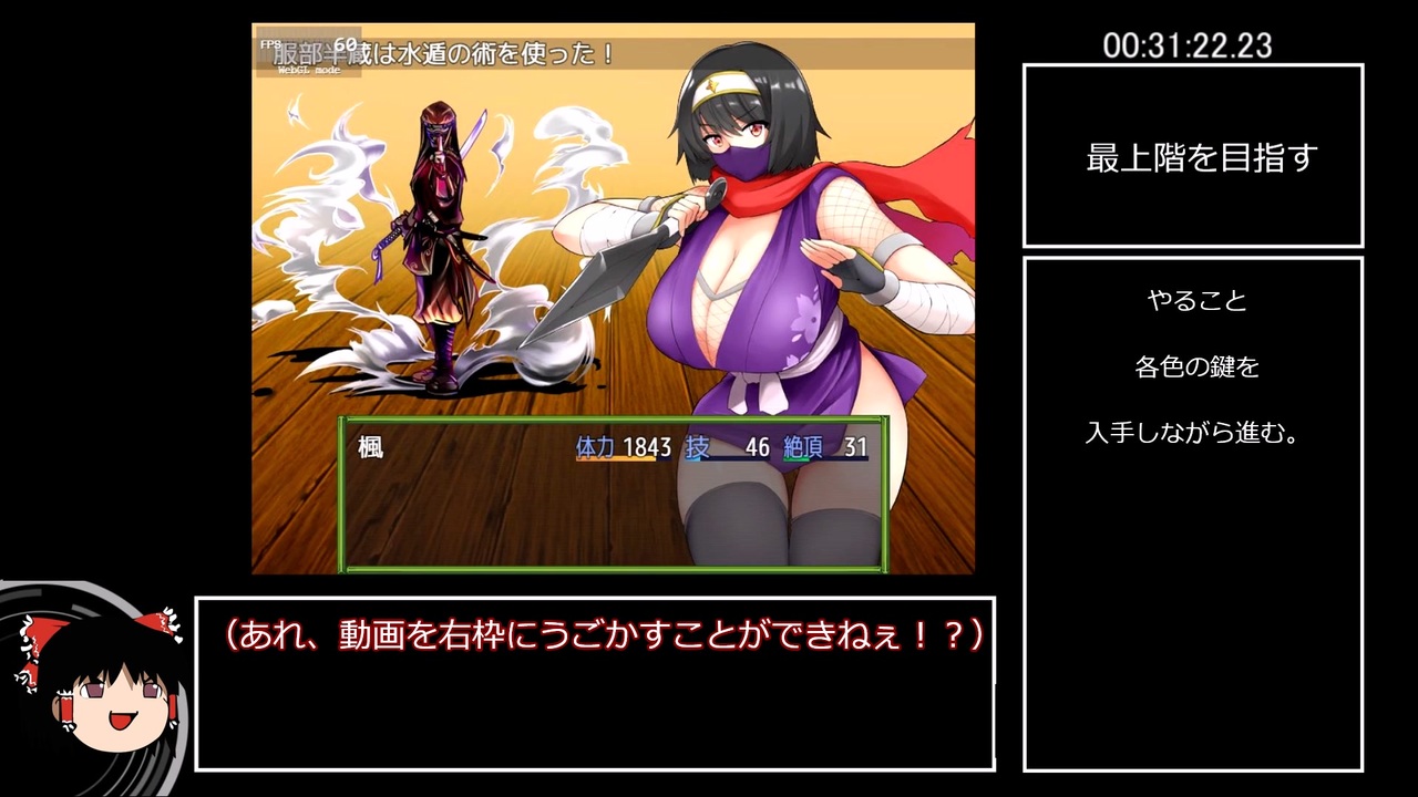 年末に投稿するつもりが年をまたいだので初投稿です。<br><br>スタジオねこキック様の出している「くノ一楓」のRTAです。<br>普通にネタバレしてるので未プレイの方はご注意ください。<br>(動画内でしている説明は間違っていることが大いにあります。間違ってたらすみません)<br><br>レギュレーション(?)<br>始めからを選択と同時にタイマースタート<br>タイトル画面に戻ってきたときにタイマーストップ<br><br>販売サイト(※R‐18注意):<a href="https://www.dlsite.com/maniax/work/=/product_id/RJ239411.html" target="_blank" rel="noopener nofollow">https://www.dlsite.com/maniax/work/=/product_id/RJ239411.html</a><br>RTAマイリスト→<a href="https://www.nicovideo.jp/mylist/68440659" target="_blank" rel="noopener">mylist/68440659</a><br>前回→くノ一楓(前) <a href="https://www.nicovideo.jp/watch/sm41336729" class="watch">sm41336729</a><br>次→怪盗エフィー <a href="https://www.nicovideo.jp/watch/sm41838500" class="watch">sm41838500</a>