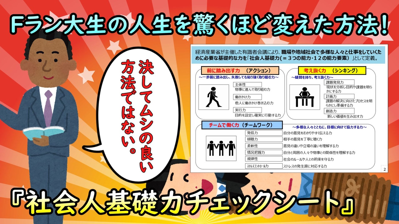 社会人基礎力チェックシートのテンプレ↓<br><a href="https://docs.google.com/spreadsheets/d/1VzQZT5aXSe3tIk8rxhdz3BKE3uI5t6oJcy4XXgOIONc/edit?usp=sharing" target="_blank" rel="noopener nofollow">https://docs.google.com/spreadsheets/d/1VzQZT5aXSe3tIk8rxhdz3BKE3uI5t6oJcy4XXgOIONc/edit?usp=sharing</a><br><br>その他作品(いらすとや動画等)<a href="https://www.nicovideo.jp/mylist/54754050" target="_blank" rel="noopener">mylist/54754050</a><br>Fの就職情報<a href="https://f-syukatu.com" target="_blank" rel="noopener nofollow">https://f-syukatu.com</a><br>youtubeチャンネル<br><a href="https://www.youtube.com/channel/UCqRV_ZIQhVKfxG1_WkNiRbg" target="_blank" rel="noopener nofollow">https://www.youtube.com/channel/UCqRV_ZIQhVKfxG1_WkNiRbg</a><br><br>ツイッター<br><a href="https://twitter.com/F_kokutiyou" target="_blank" rel="noopener nofollow">https://twitter.com/F_kokutiyou</a>