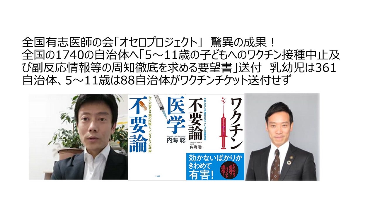 全国有志医師の会の取り組みにより、<br>361自治体が乳幼児に接種券送付せず、88自治体が子供に送付せず<br>その結果、一回目接種が23年1月9日時点で、5歳から11歳は23.6%、乳幼児は2.4%にとどまる<br>やはり一斉にワクチンチケット(死の手紙)を送り付け、接種推奨することが害悪といえる<br><a href="https://vmed.jp/2699/" target="_blank" rel="noopener nofollow">https://vmed.jp/2699/</a><br><br>日本国独立宣言論 私は独立を宣言する! 真田信秋<br><a href="https://amzn.to/3D90lwx" target="_blank" rel="noopener nofollow">https://amzn.to/3D90lwx</a><br> <br>主権者命令書 主権破壊を許すな 売国傀儡日本政府を解体せよ<br><a href="https://amzn.to/49z51b5" target="_blank" rel="noopener nofollow">https://amzn.to/49z51b5</a><br> <br>マトリックス洗脳社会 グローバル企業ディストピア<br><a href="https://amzn.to/4g2YmZg" target="_blank" rel="noopener nofollow">https://amzn.to/4g2YmZg</a><br><br>メディア廃棄宣言 高橋清隆さん<br><a href="https://amzn.to/3BfdYKg" target="_blank" rel="noopener nofollow">https://amzn.to/3BfdYKg</a>
