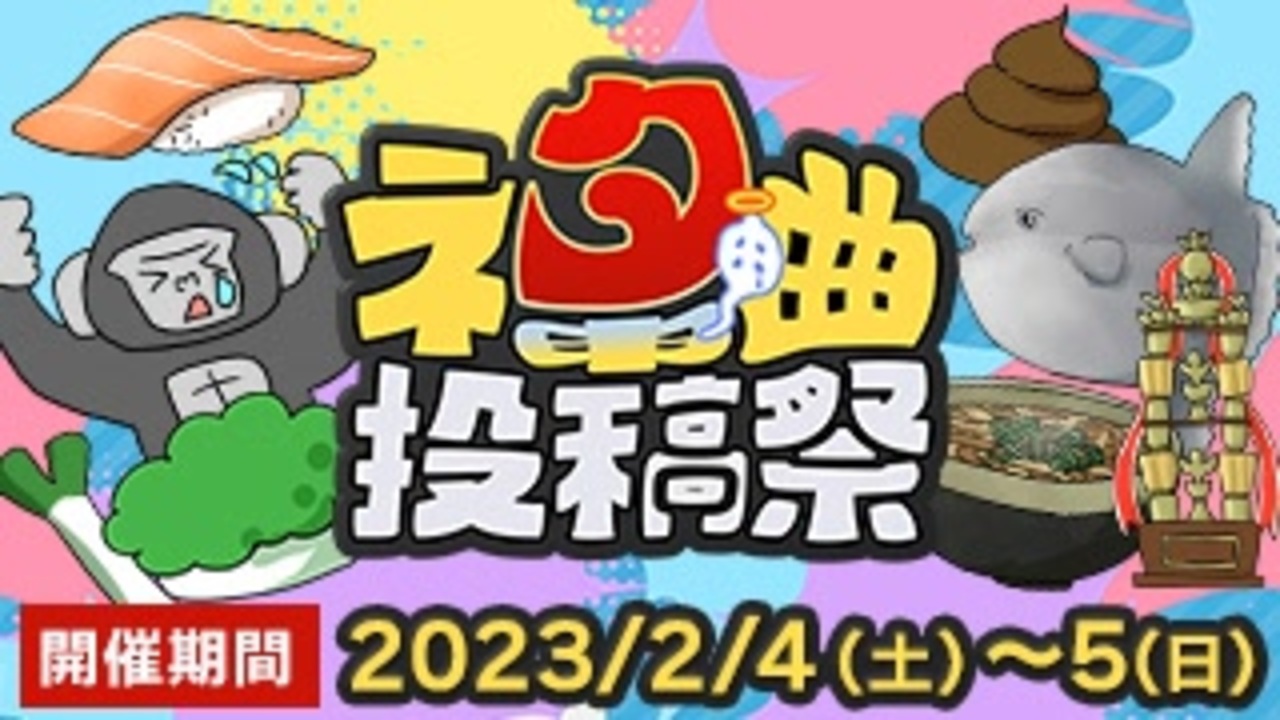 ボカロネタ曲の祭典、闇のボカコレ、『ネタ曲投稿祭2023』が帰ってくる!<br><br>どんなネタ曲も大歓迎!曲名でふざけてもよし、歌詞でふざけてもよし、曲調でふざけてもよしです!やけにクールぶったかっこいい風のボカロ曲で溢れてる現在のVOCALOIDランキングを、この日だけネタ曲で埋めつくしてボカロキッズとビルボードを泣かせましょう!<br>参加作品は運営による生放送で全曲紹介します。<br><br>・投稿期間 2023.2/4~5<br>・リスナー投票期間 2/12まで<br>・巡回生放送日時 ネタ曲投稿祭ツイッターアカウントでアナウンスします。<a href="https://twitter.com/NETAKYOKU_FES" target="_blank" rel="noopener nofollow">https://twitter.com/NETAKYOKU_FES</a><br><br>↓参加方法・ルール・参加者一覧など詳細はこちら<br><a href="https://twipla.jp/events/535885" target="_blank" rel="noopener nofollow">https://twipla.jp/events/535885</a><br><br>◇運営メンバー<br>〇企画・代表 子牛<br><a href="https://twitter.com/COWshi504" target="_blank" rel="noopener nofollow">https://twitter.com/COWshi504</a><br>〇副代表 茶々尾ひろ<br><a href="https://twitter.com/0319HIROp" target="_blank" rel="noopener nofollow">https://twitter.com/0319HIROp</a><br>〇アルティメットコーディネーター兼パーフェクトアナライザー なおりん(おはずんP)<br><a href="https://twitter.com/NRJS0617" target="_blank" rel="noopener nofollow">https://twitter.com/NRJS0617</a><br>〇スーパキラキラカラフルクッキリディストリビューター:はゆ茶<br><a href="https://twitter.com/HaYuTeA" target="_blank" rel="noopener nofollow">https://twitter.com/HaYuTeA</a><br>〇ブリリアントエグゼクティヴプロデューサー:南ノ南<br><a href="https://twitter.com/mnmno373" target="_blank" rel="noopener nofollow">https://twitter.com/mnmno373</a><br>〇kawaii future bass:榊みむ<br><a href="https://twitter.com/Kashiwa_mimu" target="_blank" rel="noopener nofollow">https://twitter.com/Kashiwa_mimu</a><br><br>【告知動画参加クリエイター】<br>ロゴ製作 rsk<br><a href="https://twitter.com/rsktter" target="_blank" rel="noopener nofollow">https://twitter.com/rsktter</a><br>キービジュアルイラスト製作 セリフ<br><a href="https://twitter.com/serifu_krag" target="_blank" rel="noopener nofollow">https://twitter.com/serifu_krag</a><br><br>【使用楽曲】<br>この世の終わりみたいなボカコレ / 油性 <a href="https://www.nicovideo.jp/watch/sm39677700" class="watch">sm39677700</a>