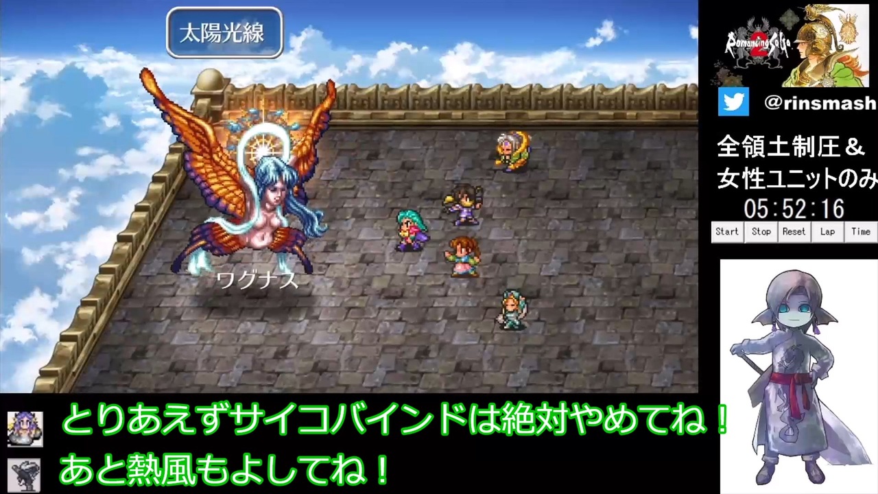 <a href="https://www.nicovideo.jp/watch/sm41545518" class="watch">sm41545518</a>←前 <a href="https://www.nicovideo.jp/mylist/74081215" target="_blank" rel="noopener">mylist/74081215</a> 次→<a href="https://www.nicovideo.jp/watch/sm41674350" class="watch">sm41674350</a><br><a href="https://www.nicovideo.jp/series/371668" target="_blank" rel="noopener nofollow">https://www.nicovideo.jp/series/371668</a><br><br>・使用するのはレオン代除いて女性ユニットのみ<br>・クリアするまでに全領土を制圧する(ダンジョン除外)<br><br>録画元は自分のニコニコ生放送です<br><br>プレイ環境<br>Switch版ロマサガ2HDリメイク<br><br>他の投稿動画シリーズ(一部)<br>【完全ノータンク縛り】メトロイドプライムハードモード <a href="https://www.nicovideo.jp/user/652845/series/500012" target="_blank" rel="noopener nofollow">https://www.nicovideo.jp/user/652845/series/500012</a><br>FF5縛りありRTA(ゆっくり実況) <a href="https://www.nicovideo.jp/series/322107" target="_blank" rel="noopener nofollow">https://www.nicovideo.jp/series/322107</a><br>迫真ガバガバ将棋部 <a href="https://www.nicovideo.jp/series/231191" target="_blank" rel="noopener nofollow">https://www.nicovideo.jp/series/231191</a><br>メトロイドドレッドRTA <a href="https://www.nicovideo.jp/series/288461" target="_blank" rel="noopener nofollow">https://www.nicovideo.jp/series/288461</a><br>STGとか <a href="https://www.nicovideo.jp/series/232145" target="_blank" rel="noopener nofollow">https://www.nicovideo.jp/series/232145</a><br><br>YouTube版<br><a href="https://youtu.be/pdgBmVo_BY8" target="_blank" rel="noopener nofollow">https://youtu.be/pdgBmVo_BY8</a><br><br>シン兄貴、White_Cat兄貴、wara兄貴、きくたん兄貴、KAZUKiX兄貴、みけ猫兄貴、ガーナ兄貴、華乃音兄貴、sai10兄貴、鎖マン兄貴、キキ兄貴、大工兄貴、苦沙弥兄貴、tonton兄貴、ハースガルド兄貴、揚げ玉たこやき兄貴、ng51兄貴、(ナ)ナオ兄貴、サイン兄貴、uni兄貴、tatibana兄貴、マカヒキ兄貴、あるぽん兄貴、oganinja兄貴、ドバサガ兄貴、こわし兄貴、BIT兄貴、Lui兄貴、RF-90/EROベイダー兄貴、ソードマスター兄貴、Siita兄貴、時の君兄貴、mkolp兄貴、C8兄貴、Noron兄貴、ながつき兄貴、量産型運河兄貴、normadz兄貴、どうも兄貴、NS-ND5兄貴、GGG兄貴、punipuni兄貴、春巻兄貴、フルアーマーZZガンダムFAZZ兄貴、<a href="https://www.nicovideo.jp/watch/sm13869948" class="watch">sm13869948</a>兄貴、鳩鰹兄貴、あさなぶ。兄貴、もえか兄貴、リゼィエ兄貴、ツカサ兄貴、色白腹黒兄貴、広告ありがとナス!
