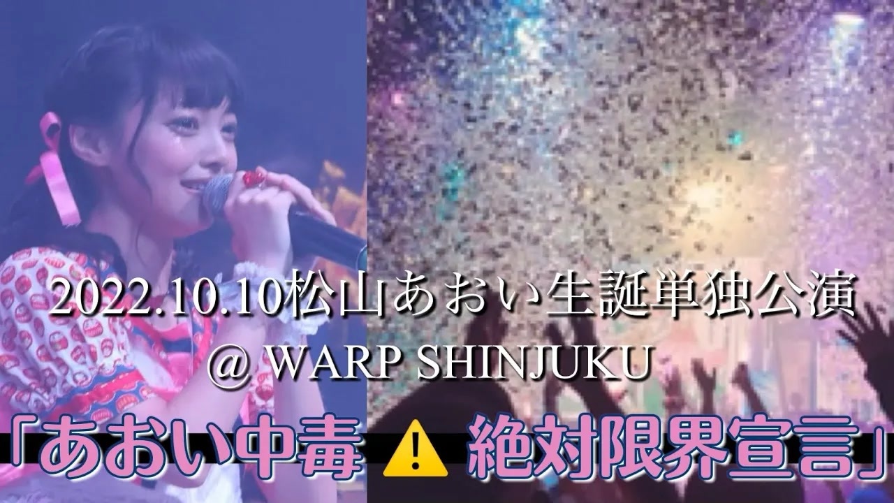 <br>2022/10/10(月・祝)WARP SHINJUKU で開催した<br>松山あおい生誕単独公演 「あおい中毒⚠️絶対限界宣言」<br><br>♪あおい中毒⚠️絶対限界宣言(FULL)<br>作詞作曲 松山あおい<br>編集 熊本哲也<br><br>ニコドル部チャレンジ中!キャンペーン対象動画<br><br>松山あおい(ニコドル部)対象動画マイリスト↓<br><a href="https://nico.ms/mylist/74339156" target="_blank" rel="noopener nofollow">https://nico.ms/mylist/74339156</a><br><br>グランプリでニコニコ生放送公式番組、雑誌にグラビア掲載!<br><br>再生数、コメント数、マイリスト数、いいね!数 が多いほどランキング上位になります!よろしくお願いします(><)<br><br><br>松山あおい<br>ツイッター <a href="https://twitter.com/aoi_15candy" target="_blank" rel="noopener nofollow">https://twitter.com/aoi_15candy</a><br>TikTok <a href="https://vt.tiktok.com/ZS4tSt5c/" target="_blank" rel="noopener nofollow">https://vt.tiktok.com/ZS4tSt5c/</a><br>Instagram <a href="https://instagram.com/aoi_oix2?r=nametag" target="_blank" rel="noopener nofollow">https://instagram.com/aoi_oix2?r=nametag</a><br>ホームページ <a href="http://aoi-15days.com/" target="_blank" rel="noopener nofollow">http://aoi-15days.com/</a><br>Youtube <a href="https://youtube.com/channel/UCU1SKINOqn5EMqxF_8Z0MtQ" target="_blank" rel="noopener nofollow">https://youtube.com/channel/UCU1SKINOqn5EMqxF_8Z0MtQ</a><br>SHOWROOM <a href="https://www.showroom-live.com/aj_aoi" target="_blank" rel="noopener nofollow">https://www.showroom-live.com/aj_aoi</a>