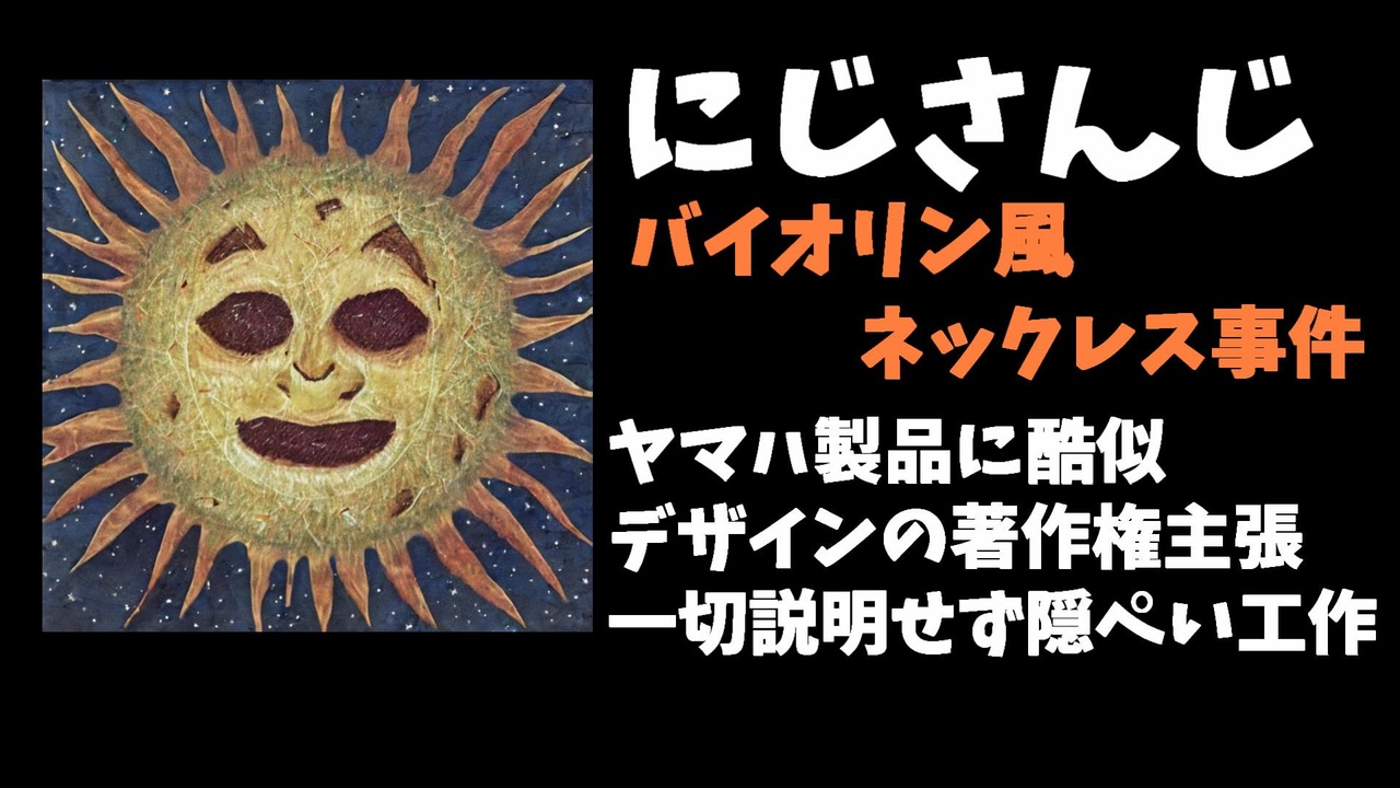 にじさんじバイオリン風ネックレス事件 3/30本目<br><br>にじさんじを運営するANYCOLOR社が1月13日から販売している「バイオリン風ネックレス」と称する商品がヤマハが意匠登録している5回もデザイン賞を取っているエレクトリックバイオリンと酷似している件と隠ぺい工作疑惑について解説します<br><br>この動画の内容の他にもまだまだ解説する部分が残っているのでこの事件に関しては毎日のように投稿していく予定です<br><br>バイオリンの酷似参考画像はこちら<br><a href="https://twitter.com/V_Virgin_Mary/status/1612098195181670400" target="_blank" rel="noopener nofollow">https://twitter.com/V_Virgin_Mary/status/1612098195181670400</a><br><br>脱ゴーマニズム宣言事件の裁判例<br><a href="https://www.courts.go.jp/app/files/hanrei_jp/161/013161_hanrei.pdf" target="_blank" rel="noopener nofollow">https://www.courts.go.jp/app/files/hanrei_jp/161/013161_hanrei.pdf</a><br><br>類似事件の動画<br>【悲報】新人VTuber、同じ絵師のVに著作権侵害で動画を削除される<br><a href="https://www.nicovideo.jp/watch/sm39815076" class="watch">sm39815076</a><br><br>参考<br>エレクトリックバイオリン YEVシリーズ<br><a href="https://www.yamaha.com/ja/news_release/2017/17031301/" target="_blank" rel="noopener nofollow">https://www.yamaha.com/ja/news_release/2017/17031301/</a><br><br>【VOLTACTION Half Anniversary】バイオリン風ネックレス(セラフ・ダズルガーデンモデル) <br><a href="https://shop.nijisanji.jp/s/niji/item/detail/SSZS-20537?ima=2801" target="_blank" rel="noopener nofollow">https://shop.nijisanji.jp/s/niji/item/detail/SSZS-20537?ima=2801</a><br><br>Youtube <a href="https://www.youtube.com/channel/UCzYQ..." target="_blank" rel="noopener nofollow">https://www.youtube.com/channel/UCzYQ...</a><br>twitter <a href="https://twitter.com/V_Virgin_Mary" target="_blank" rel="noopener nofollow">https://twitter.com/V_Virgin_Mary</a><br><br>使用素材<br>高品質なフリー動画素材 - Pixabay <a href="https://pixabay.com/ja/videos" target="_blank" rel="noopener nofollow">https://pixabay.com/ja/videos</a>