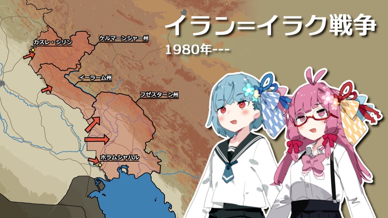 ・前史<br>時は1980年、イラン・イスラム革命により大規模な力を持っていたイラン軍が半崩壊しました。<br>それに対してイラクではフセイン大統領のもと軍備強化おこない、弱体化したイランの代わりに中東の覇権を握ろうと動きました。<br>両国の関係はイランでの革命があってからさらに悪くなり、79年から続いていた武力衝突も80年9月に入ってからエスカレートしていきました。<br>9月4日、イラク軍がケルマーンシャー州付近に大規模な砲撃をおこない、6日までにイランに占領されていた領土を解放し、9日以降からイラン=イラク国境で戦車や戦闘機が動員された小規模の衝突が続きました。<br>武力衝突が続いている中、フセイン大統領は9月17日に両国の国境線を取り決めたアルジェ協定の破棄を宣言しました。<br>そして9月22日にイラク空軍はイラン領内の空港や航空基地を爆撃し、国境紛争が戦争へと拡大することとなりました。<br><br>・素材<br>立ち絵:かれい<br>音楽:甘茶の音楽工房<br>地図:(<a href="https://maps-for-free.com" target="_blank" rel="noopener nofollow">https://maps-for-free.com</a>)<br><br>・参考文献など<br>鳥井順『イラン・イラク戦争』第三書館 1990年<br>吉村慎太郎『イラン・イスラーム体制とは何か』書肆心水 2005年<br><br>(世界史べーた より)<br>