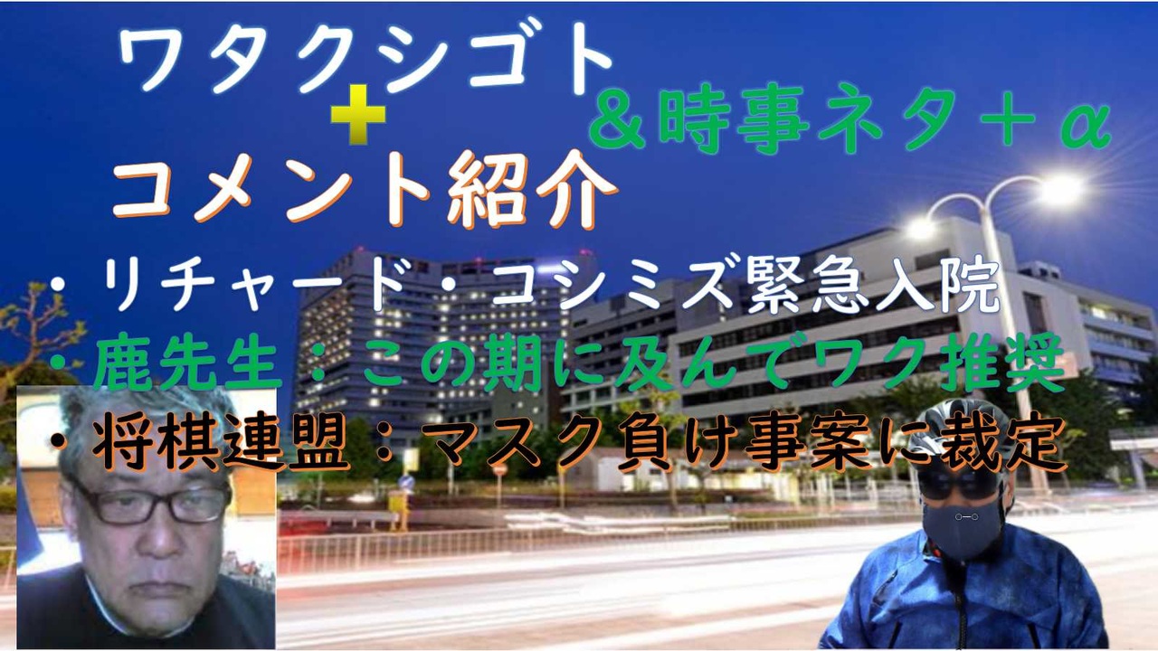 リチャード・コシミズブログ<br>緊急入院の報告<br><a href="http://08054623210.jugem.jp/?eid=181" target="_blank" rel="noopener nofollow">http://08054623210.jugem.jp/?eid=181</a><br><br>■鹿先生<br>この期に及んで打てという医者がいたらバカです<br><a href="https://www.nicovideo.jp/watch/sm41650525" target="_blank" rel="noopener nofollow">https://www.nicovideo.jp/watch/sm41650525</a><br><br><br>■SATORISM TV.259<br>「社員の7割が死んでもいいように生命保険を掛けろ!人生最大の試練を迎える社長さんたち」<br><a href="https://www.nicovideo.jp/watch/sm41651679" target="_blank" rel="noopener nofollow">https://www.nicovideo.jp/watch/sm41651679</a><br><br>■テレ朝ニュース<br>コロナとインフルは“同時には流行せず” 22カ国調査の東大など研究チーム<br><a href="https://onl.bz/3fz7FLZ" target="_blank" rel="noopener nofollow">https://onl.bz/3fz7FLZ</a><br><br><br><br>非常に憂慮すべき: ドイツの産業技術者によるワクチン成分の分析<br><a href="https://onl.bz/L1jRxxq" target="_blank" rel="noopener nofollow">https://onl.bz/L1jRxxq</a><br><br><br><br>■毎日新聞<br>佐藤天彦九段「整合性取れていない」 マスク反則負け不服却下<br><a href="https://onl.bz/Lfvapzu" target="_blank" rel="noopener nofollow">https://onl.bz/Lfvapzu</a><br><br>■日本将棋連盟<br>佐藤天彦九段の不服申立書に対する裁定<br><a href="https://onl.bz/LygGmZS" target="_blank" rel="noopener nofollow">https://onl.bz/LygGmZS</a><br><br>■深田萌絵TV<br>熊本市条例、外国人市政参画権。自民党会派が反対に回るらしい。<br><a href="https://www.youtube.com/watch?v=nn4da2ZJoyA" target="_blank" rel="noopener nofollow">https://www.youtube.com/watch?v=nn4da2ZJoyA</a><br><br><br>↓コメント紹介-------------<br><br>リチャード小清水死んだ<br><br><br>ワクチンパンデミックは種痘からわかっててスペイン風邪も計画通りだよ アフリカ人の常識<br><br><br>私も女だけど(特に男性)店員が販売促進するとき(男性客に対してより)圧力かけてくる感じがします。<br><br>私もコンビニレジででマスク渡されながら、そう言われたので品物戻して出ていきました<br><br>今発売中の週刊新潮で松村邦洋さんが良かった大河ドラマベスト5をやってましたので、ごんべいさんもされたらどうですか。<br><br>無関心ポリティカルコレクトネスですなっ。..<br><br><br>推測ですが今は口座を身分証に紐づけしてくると思うので、ただの観光客は中国の銀行口座は持てないのでは<br><br>国賓待遇の来日を許すとお返しということで日本の元首、今上陛下が中国にということになってしまう。よろしくない。<br><br><br><br><br><br><br>Twitter<br>覗いてみてください<br><a href="https://twitter.com/machigomaー" target="_blank" rel="noopener nofollow">https://twitter.com/machigomaー</a><br><br><br>