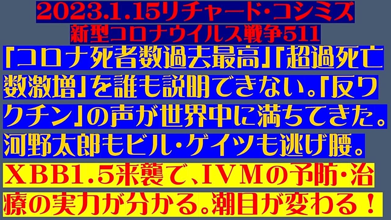 <span style="color: #cc4125;"><strong>「 テーマ:新型コロナウイルス戦争 511 」</strong></span><br><br><span style="color: #ff0000;"><strong>「『 コロナ死者数過去最高 』・『 超過死亡数激増 』を、誰も説明できない。<br><br>『 反ワクチン 』の声が、『 世界中 』に満ちてきた。『 河野太郎もビル・ゲイツ 』も『 逃げ腰 』。<br><br>『 XBB1.5 』来襲で、『 イベルメクチン 』の『 予防・治療 』の『 実力 』が分かる。『 潮目が<br> 変わる! 』」</strong></span><br><br><span style="color: #0000ff;"><strong>「『 イベルメクチン・アビガン・その他コロナ対策 』について、ご意見をお寄せ下さい! 」<br><br> ◐ E-mail:richardkoshimizu@gmail.com</strong></span><br><br><strong>◐「クリエイターサポート」・「フォロー」・「ニコニ広告」等、是非ともご協力下さい。リチャード・コシミズ</strong><br><br><span style="color: #38761d;"><strong>◐リチャード・コシミズ 講演会 公式 動画ギャラリー</strong></span><br> <a href="http://www.t-sskk.com/richardkoshimizu/video-gallery/index.html" target="_blank" rel="noopener nofollow">http://www.t-sskk.com/richardkoshimizu/video-gallery/index.html</a><br><br><span style="color: #38761d;"><strong>◐リチャード・コシミズ 講演会 ニコニコ生放送 LIVE</strong></span><br> <a href="https://bit.ly/3Bx8F5w" target="_blank" rel="noopener nofollow">https://bit.ly/3Bx8F5w</a><br><br><span style="color: #38761d;"><strong>◐リチャード・コシミズ 公式 ブログ</strong></span><br> <a href="http://08054623210.jugem.jp/" target="_blank" rel="noopener nofollow">http://08054623210.jugem.jp/</a><br><br><span style="color: #38761d;"><strong>◐リチャード・コシミズ 公式 ホームページ<br> </strong></span><a href="http://richardkoshimizu.boo.jp/" target="_blank" rel="noopener nofollow">http://richardkoshimizu.boo.jp/</a><br><br><span style="color: #38761d;"><strong>◐リチャード・コシミズ 公式 Twitter</strong></span><br> <a href="https://twitter.com/rickoshimizu" target="_blank" rel="noopener nofollow">https://twitter.com/rickoshimizu</a><br>