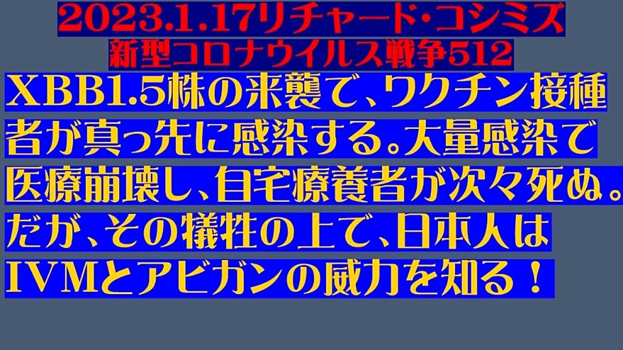 <span style="color: #cc4125;"><strong>「 テーマ:新型コロナウイルス戦争 512 」</strong></span><br><br><span style="color: #ff0000;"><strong>「『 XBB1.5株 』の『 来襲 』で、『 ワクチン接種者 』が『 真っ先 』に『 感染 』する。『 大量感染 』で<br> 『 医療崩壊 』し、『 自宅療養者 』が次々『 死ぬ 』。だが、その『 犠牲 』の上で、『 日本人 』は『 イ<br> ベルメクチン 』と『 アビガン 』の『 威力を知る! 』」</strong></span><br><br><span style="color: #0000ff;"><strong>「『 イベルメクチン・アビガン・その他コロナ対策 』について、ご意見をお寄せ下さい! 」<br><br>◐ E-mail:richardkoshimizu@gmail.com</strong></span><br><br><strong>◐「クリエイターサポート」・「フォロー」・「ニコニ広告」等、是非ともご協力下さい。リチャード・コシミズ</strong><br><br><span style="color: #38761d;"><strong>◐リチャード・コシミズ 講演会 公式 動画ギャラリー</strong></span><br> <a href="http://www.t-sskk.com/richardkoshimizu/video-gallery/index.html" target="_blank" rel="noopener nofollow">http://www.t-sskk.com/richardkoshimizu/video-gallery/index.html</a><br><br><span style="color: #38761d;"><strong>◐リチャード・コシミズ 講演会 ニコニコ生放送 LIVE</strong></span><br> <a href="https://bit.ly/3Bx8F5w" target="_blank" rel="noopener nofollow">https://bit.ly/3Bx8F5w</a><br><br><span style="color: #38761d;"><strong>◐リチャード・コシミズ 公式 ブログ</strong></span><br> <a href="http://08054623210.jugem.jp/" target="_blank" rel="noopener nofollow">http://08054623210.jugem.jp/</a><br><br><span style="color: #38761d;"><strong>◐リチャード・コシミズ 公式 ホームページ<br> </strong></span><a href="http://richardkoshimizu.boo.jp/" target="_blank" rel="noopener nofollow">http://richardkoshimizu.boo.jp/</a><br><br><span style="color: #38761d;"><strong>◐リチャード・コシミズ 公式 Twitter</strong></span><br> <a href="https://twitter.com/rickoshimizu" target="_blank" rel="noopener nofollow">https://twitter.com/rickoshimizu</a><br>