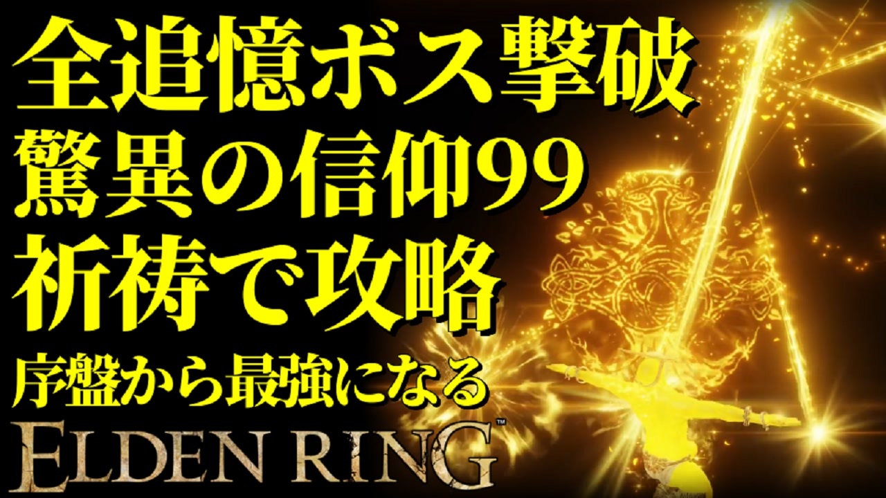 ストーリー序盤から最強になるELDENRING<br>【動画の内容】<br>サクサク攻略・編集・解説<br>アンバサビルド:信仰特化<br>祈祷メインで全追憶ボスを撃破します<br><br><strong>30分に抑えるためにカットしまくってます</strong><br>完全版を見たい方⇒<a href="https://www.youtube.com/watch?v=SMhD8solwts" target="_blank" rel="noopener nofollow">https://www.youtube.com/watch?v=SMhD8solwts</a><br>喪色武器+10作成ルート⇒<a href="https://www.nicovideo.jp/watch/sm40949999" class="watch">sm40949999</a><br><br>コナンの黒い人の侵入⇒<a href="https://www.nicovideo.jp/watch/sm40123217" target="_blank" rel="noopener nofollow">https://www.nicovideo.jp/watch/sm40123217</a><br>その他のエルデンリング動画はYouTubeにあげてます<br>YouTube⇒<a href="https://www.youtube.com/channel/UC4BkylcNgiMoFvpYPpcZEEw" target="_blank" rel="noopener nofollow">https://www.youtube.com/channel/UC4BkylcNgiMoFvpYPpcZEEw</a><br>Twitter⇒<a href="https://twitter.com/0141ktkr" target="_blank" rel="noopener nofollow">https://twitter.com/0141ktkr</a>