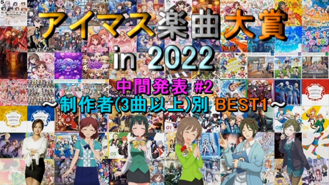 <span style="color: #ff0000;"><strong>2022年にFull音源版が発売 or 配信</strong></span>されたアイマス関連の楽曲<br>(<span style="color: #0000ff;"><strong>計179曲</strong></span>)に対する人気投票企画の中間発表2回目です。<br>参加者<span style="color: #00ff00;"><strong>900名</strong></span>の時点の結果から、<span style="color: #ffd966;"><strong>3曲以上の楽曲に関わった<br>制作者34名の各1位</strong></span>をご紹介します。<br><br><span style="font-size: 18px;"><strong>※最終結果投稿しました!⇒<a href="https://www.nicovideo.jp/watch/sm41799077" class="watch">sm41799077</a></strong></span><br><br>○告知動画:<a href="https://www.nicovideo.jp/watch/sm41587068" class="watch">sm41587068</a><br>○中間1回目(発売・配信月別BEST3 or 5):<a href="https://www.nicovideo.jp/watch/sm41633222" class="watch">sm41633222</a><br>○中間3回目(5pt票率 BEST30):<a href="https://www.nicovideo.jp/watch/sm41704852" class="watch">sm41704852</a><br><br>●「アイマス楽曲大賞 最終結果まとめ」:<a href="https://www.nicovideo.jp/mylist/70533939" target="_blank" rel="noopener">mylist/70533939</a><br>●『アイマス楽曲ランキングシリーズ』:<a href="https://www.nicovideo.jp/mylist/57911966" target="_blank" rel="noopener">mylist/57911966</a><br>●『THE IDOLM@STER Song Collection』:<a href="https://www.nicovideo.jp/mylist/61493969" target="_blank" rel="noopener">mylist/61493969</a>