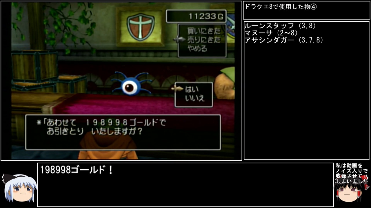 Ⅷになってからボス直前で区切ることが増えましたが、そうすると一度目の出力は問題ないのに、二度目の出力時に音ズレが発生する不思議。<br>応急処置として録画動画を録画して対応した影響で、ゲモン戦が始まった瞬間に画面サイズが少し変わります。<br>実はpart113の冒頭でも同じことをしていたので、一応追記で記載しておきました。丁寧に直す余裕がなくて申し訳ないです。<br><br><br>動画内でお見せしたDQⅩで試している方の動画→<a href="https://www.youtube.com/watch?v=Zr2Su_iI8WU" target="_blank" rel="noopener nofollow">https://www.youtube.com/watch?v=Zr2Su_iI8WU</a><br><br>前→<a href="https://www.nicovideo.jp/watch/sm41676516" class="watch">sm41676516</a> 次→<a href="https://www.nicovideo.jp/watch/sm41709503" class="watch">sm41709503</a><br><br>YouTube版→<a href="https://youtu.be/LWTQboFgXP4" target="_blank" rel="noopener nofollow">https://youtu.be/LWTQboFgXP4</a><br><br><br>※動画の大きさが変わる方は、お手数ですが設定→画質を自動から〇pに変えると解決します。<br>※一部機種は互換機を使用してのプレイとなります。<br><br>縛りルール(不明点はシリーズのQ&Aを参照)<br>①使った武器・防具・装飾品・道具・呪文・特技・一部特殊施設(メダル王・カジノ・移民の町)・職業(3,6,7)・仲間モンスター(4,5,6,8+7の職業)は次以降のシリーズで使用禁止。<br>(NPCキャラが使用した装備や呪文を含む。売却及び錬金素材としても使用扱い)<br><br>②裏技・バグ技の禁止。<br><br>③逃走禁止&戦闘終了時は全員生存。<br><br>④レベルを上げ過ぎない。<br>ダンジョンやボスは公式ガイドブックに記載されたレベル+3まで。<br>ラスボスは全ての呪文を習得するレベル+3程度までに収める。<br><br>⑤裏ボスも規定回数、規定ターン以内に倒す。<br>(6の裏ダンジョン突入時のみ、条件を満たすため①の職業を解禁)<br><br>(おまけ)<br>宝は可能なものに限り全回収。<br>5と6は同一モンスターの仲間不可。<br>回避可能なボスも全て倒す。<br><br><br>この動画で利用している株式会社スクウェア・エニックスを代表とする共同著作者が権利を所有する著作物及びスギヤマ工房有限会社が権利を所有する楽曲の転載・配布は禁止いたします。<br>(C) ARMOR PROJECT/BIRD STUDIO/SQUARE ENIX All Rights Reserved.<br>(C) SUGIYAMA KOBO (P) SUGIYAMA KOBO<br><br>AquesTalk2ライセンスID:AQTK2WINUSR23122185<br /><br><br>❤いいねを押していただけるとモチベーションと投稿速度が上がるので宜しくお願い致します!<br><br>作者ツイッター→ <a href="https://twitter.com/nig0117" target="_blank" rel="noopener nofollow">https://twitter.com/nig0117</a><br>PIXIV FANBOX→ <a href="https://sutanokeiji.fanbox.cc/" target="_blank" rel="noopener nofollow">https://sutanokeiji.fanbox.cc/</a><br><br>( 以前はWEB小説書いてました→ <a href="https://kakuyomu.jp/works/1177354054884910267" target="_blank" rel="noopener nofollow">https://kakuyomu.jp/works/1177354054884910267</a> )