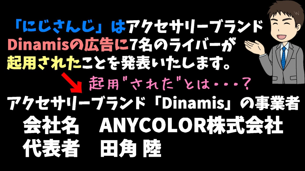 2023年1月23日、にじさんじ運営より「アクセサリーブランドDinamisの広告に、7名のライバーが起用されたことを発表いたします。」とのプレリリースがあったのですが、そのブランドを作ったのは同じ運営のANYCOLORであることがサイトに書いてあり、自分たちで起用しただけなのに「モデルに起用された」と妙な発表をしていると話題です。<br><br>にじさんじの発表<br><a href="https://twitter.com/nijisanji_app/status/1617394337301803009" target="_blank" rel="noopener nofollow">https://twitter.com/nijisanji_app/status/1617394337301803009</a><br><br>Dinamisの運営会社<br><a href="https://dinamis.stores.jp/tokushoho" target="_blank" rel="noopener nofollow">https://dinamis.stores.jp/tokushoho</a><br><br>バイオリン比較画像はこちら<br><a href="https://twitter.com/V_Virgin_Mary/status/1616045422564487172" target="_blank" rel="noopener nofollow">https://twitter.com/V_Virgin_Mary/status/1616045422564487172</a><br><br>にじさんじ運営のガーリーコレクション騒動時の謝罪ツイート<br><a href="https://twitter.com/nijisanji_app/status/1505348404271992832" target="_blank" rel="noopener nofollow">https://twitter.com/nijisanji_app/status/1505348404271992832</a><br><br>バイオリンの酷似参考画像はこちら<br><a href="https://twitter.com/V_Virgin_Mary/status/1612098195181670400" target="_blank" rel="noopener nofollow">https://twitter.com/V_Virgin_Mary/status/1612098195181670400</a><br><br>参考<br>エレクトリックバイオリン YEVシリーズ<br><a href="https://www.yamaha.com/ja/news_release/2017/17031301/" target="_blank" rel="noopener nofollow">https://www.yamaha.com/ja/news_release/2017/17031301/</a><br><br>【VOLTACTION Half Anniversary】バイオリン風ネックレス(セラフ・ダズルガーデンモデル) <br><a href="https://shop.nijisanji.jp/s/niji/item/detail/SSZS-20537?ima=2801" target="_blank" rel="noopener nofollow">https://shop.nijisanji.jp/s/niji/item/detail/SSZS-20537?ima=2801</a><br><br>Youtube <a href="https://www.youtube.com/@V_Virgin_Mary" target="_blank" rel="noopener nofollow">https://www.youtube.com/@V_Virgin_Mary</a><br>twitter <a href="https://twitter.com/V_Virgin_Mary" target="_blank" rel="noopener nofollow">https://twitter.com/V_Virgin_Mary</a><br><br>使用素材<br>高品質なフリー動画素材 - Pixabay <a href="https://pixabay.com/ja/videos" target="_blank" rel="noopener nofollow">https://pixabay.com/ja/videos</a>