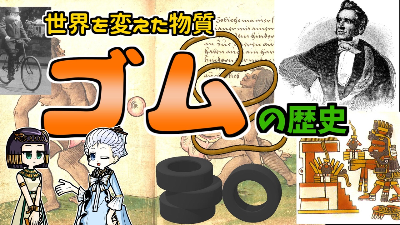 マリーちゃんは大事な話があるようです。<br><br>よくよく考えたら「ゴム」ってかなり謎な存在ですよね。<br>適当に街を歩いて写真をパシャパシャ撮りましょう。<br>家に帰って見てみましょう。<br><br>ゴムがいっさい含まれていない風景があるでしょうか?<br>それの、話です。<br><br>今回の参考文献:<br><br>ペニー・ルクーター/ジェイ・バーレサン(2011)『スパイス、爆薬、医薬品 世界史を変えた17の化学物質』(小林力訳)中央公論新社<br>佐藤健太郎(2018)『世界史を変えた新素材』新潮社<br><br>その他 Wikipediaなど<br />━━━━━━━━━━━━━━━━━━━━━<br><br>この動画はクリエイティブ・コモンズ継承(CC-BY-SA)ライセンスの素材を使用して制作しています。(<a href="https://creativecommons.org/licenses/by-sa/4.0/)" target="_blank" rel="noopener nofollow">https://creativecommons.org/licenses/by-sa/4.0/)</a><br>規約に基づき、この動画もCC-BY-SA 4.0 のもとで公開します。<br><br>投稿者共通情報☆彡<br><br>BGM, SE:ニコニ・コモンズ様<br><a href="http://commons.nicovideo.jp/" target="_blank" rel="noopener nofollow">http://commons.nicovideo.jp/</a><br>魔王魂様<br><a href="https://maoudamashii.jokersounds.com/" target="_blank" rel="noopener nofollow">https://maoudamashii.jokersounds.com/</a><br>Audiostock様<br><a href="https://audiostock.jp/" target="_blank" rel="noopener nofollow">https://audiostock.jp/</a><br><br>立ち絵 霊夢・魔理沙(黒子式):nicotalk様<br><a href="http://www.nicotalk.com/charasozai.html" target="_blank" rel="noopener nofollow">http://www.nicotalk.com/charasozai.html</a><br><br>立ち絵 パトラ、マリー、アン、メアリ:ライフライフ様<br><a href="https://0801lifelife.tumblr.com/" target="_blank" rel="noopener nofollow">https://0801lifelife.tumblr.com/</a><br><br>使用ツール1:ゆっくりムービーメーカー4<br><a href="https://manjubox.net/ymm4/" target="_blank" rel="noopener nofollow">https://manjubox.net/ymm4/</a><br><br>使用ツール2:AviUtl<br><a href="http://spring-fragrance.mints.ne.jp/aviutl/" target="_blank" rel="noopener nofollow">http://spring-fragrance.mints.ne.jp/aviutl/</a><br><br>各時代の地図 : World History Maps & Timelines <br><a href="http://geacron.com/home-en/" target="_blank" rel="noopener nofollow">http://geacron.com/home-en/</a><br><br>ゆっくりボイスについて:AquesTalkライセンス取得済み<br><br>キャラクターボイス<br>アン・ボニー:羽ノ華(A.I.VOICE)<br>メアリ・リード:琴葉 葵(A.I.VOICE)<br>クレオパトラ:結月ゆかり(VOICEROID2)<br>マリー‐アントワネット:東北きりたん (VOICEROID EX)<br>その他キャラ:青山龍星(A.I.VOICE)、伊織弓鶴(A.I.VOICE2)、栗田まろん(A.I.VOICE)、宮舞モカ(VOICEPEAK)、フリモメン(VOICEPEAK)<br><br><br><br>その他フリー素材ご提供元の皆様に圧倒的感謝<br>