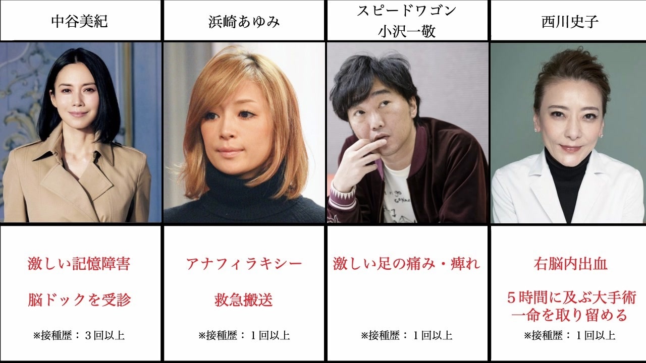 ■参考記事<br>【自業自得】河野太郎とコラボし、コロナワクチンを推進した芸能人が全員入院していたことが発覚<br><a href="http://rapt-plusalpha.com/28510/" target="_blank" rel="noopener nofollow">http://rapt-plusalpha.com/28510/</a><br><br>【コロナワクチンの副反応の疑い】女優「中谷美紀」が記憶障害に「飛行機の乗り遅れ」や「日時間違い」を繰り返し脳ドックを受ける<br><a href="http://rapt-plusalpha.com/55855/" target="_blank" rel="noopener nofollow">http://rapt-plusalpha.com/55855/</a><br><br>浜崎あゆみがコロナワクチン接種後にアナフィラキシーショックを起こし、一時意識不明に<br><a href="http://rapt-plusalpha.com/24637/" target="_blank" rel="noopener nofollow">http://rapt-plusalpha.com/24637/</a><br><br>ファイザー製ワクチンを接種した西川史子 脳内出血で倒れ、5時間におよぶ大手術<br><a href="http://rapt-plusalpha.com/19225/" target="_blank" rel="noopener nofollow">http://rapt-plusalpha.com/19225/</a><br><br>日テレアナウンサー河村亮、脳出血で死去 54歳 コロナワクチンの副反応の疑い<br><a href="http://rapt-plusalpha.com/42957/" target="_blank" rel="noopener nofollow">http://rapt-plusalpha.com/42957/</a><br><br>【中日ドラゴンズ】コロナワクチン接種後のトレーニング中に劇症型心筋炎で死亡した木下雄介投手の遺族に対し、球団側が5000万円の補償金支払いを拒否<br><a href="http://rapt-plusalpha.com/48280/" target="_blank" rel="noopener nofollow">http://rapt-plusalpha.com/48280/</a><br><br>【コロナワクチン後遺症か】『益若つばさ』が顔面に重度の帯状疱疹 昨年からめまい・記憶障害に悩まされ、療養を延長へ<br><a href="http://rapt-plusalpha.com/64045/" target="_blank" rel="noopener nofollow">http://rapt-plusalpha.com/64045/</a><br><br>アニソンの帝王『水木一郎』が死去 2ヶ月前に4回目のコロナワクチン接種<br><a href="http://rapt-plusalpha.com/62018/" target="_blank" rel="noopener nofollow">http://rapt-plusalpha.com/62018/</a><br><br>コロナワクチン3回接種の『和田アキ子』、持病悪化により歩行困難、右目の視力ほぼ喪失、関節リウマチ発症 毎日憂鬱で泣きながら食事していると明かす<br><a href="http://rapt-plusalpha.com/64768/" target="_blank" rel="noopener nofollow">http://rapt-plusalpha.com/64768/</a><br><br>【コロナワクチンの広告塔】元SMAPの中居正広が、体調不良で年内休養を発表 昨年8月に2回目接種を終了<br><a href="http://rapt-plusalpha.com/61122/" target="_blank" rel="noopener nofollow">http://rapt-plusalpha.com/61122/</a>