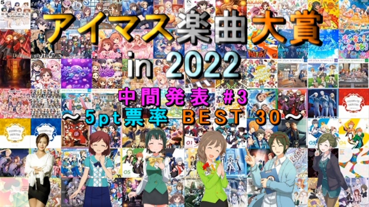 <span style="color: #ff0000;"><strong>2022年にFull音源版が発売 or 配信</strong></span>されたアイマス関連の楽曲<br>(<span style="color: #0000ff;"><strong>計179曲</strong></span>)に対する人気投票企画の中間発表3回目です。<br><span style="color: #00ff00;"><strong>参加者1300名</strong></span>の時点の結果から、<span style="color: #ff9900;"><strong>5pt票率の上位30曲</strong></span>をご紹介します。<br><br>※5pt票率=<span style="color: #ff00ff;"><strong>各楽曲の獲得5pt票数</strong></span>÷<span style="color: #00ffff;"><strong>各楽曲の獲得総票数</strong></span><br>※同率の順位の場合は順位右に「<span style="color: #9900ff;"><strong>T</strong></span>」を表示。<br><br><span style="font-size: 18px;"><strong>※最終結果投稿しました!⇒<a href="https://www.nicovideo.jp/watch/sm41799077" class="watch">sm41799077</a></strong></span><br><br>○告知動画:<a href="https://www.nicovideo.jp/watch/sm41587068" class="watch">sm41587068</a><br>○中間2回目(制作者別 BEST1):<a href="https://www.nicovideo.jp/watch/sm41669108" class="watch">sm41669108</a><br><br>●「アイマス楽曲大賞 最終結果まとめ」:<a href="https://www.nicovideo.jp/mylist/70533939" target="_blank" rel="noopener">mylist/70533939</a><br>●『アイマス楽曲ランキングシリーズ』:<a href="https://www.nicovideo.jp/mylist/57911966" target="_blank" rel="noopener">mylist/57911966</a><br>●『THE IDOLM@STER Song Collection』:<a href="https://www.nicovideo.jp/mylist/61493969" target="_blank" rel="noopener">mylist/61493969</a>